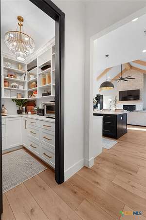 Modern and luxurious, this Jace & Bowen Custom Builders home sits on 5 acres with a wildlife exemption and offers 5 bedrooms and 4.5 bathrooms with exceptional craftsmanship throughout. The grand entryway features soaring 20 foot ceilings, Nu Core luxury vinyl plank flooring, and high beamed ceilings that enhance the open layout. Quartz countertops and backsplash extend through the kitchen and baths, creating a cohesive modern design. The gourmet kitchen highlights quartz surfaces, a large center island, maple cabinetry, and Moen fixtures. ZLINE Energy Star rated appliances include a dual gas/electric range oven, pot filler, automatic microwave drawer, and a vented recirculating hood system. The primary bath features a mirrored barn door entry, dual vanities with quartz counters, a spacious walk in quartz shower with handheld sprayer, and a soaking tub accented by a chandelier and wall mounted TV. The adjoining walk in closet offers custom built ins. A dedicated office with stunning built ins provides an elegant workspace. Anderson 100 Series windows with Fibrex frames fill the home with natural light. The upstairs loft with full bath offers flexibility for an additional bedroom or living area. The insulated three car garage includes a sauna, storage, and an acclimatized room with cooled walk-in space. A 500 gallon underground propane tank and 3,000 gallon water storage tank add efficiency. Outdoor living features a covered back porch with gas log fireplace plumbed for an outdoor kitchen and a barn with electricity.