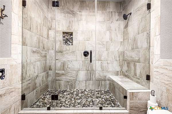 - Built In Features, Carbon Monoxide Detector, Ceiling Fans, Custom Cabinets, Double Vanity, Game Room, Garden Tub Roman Tub, High Ceilings, Kitchen Island, Main Level Primary, Multiple Dining Areas, Multiple Living Areas, Primary Downstairs, Separate Formal Dining Room, Separate Shower, Solid Surface Counters, Tub Shower, Window Treatments