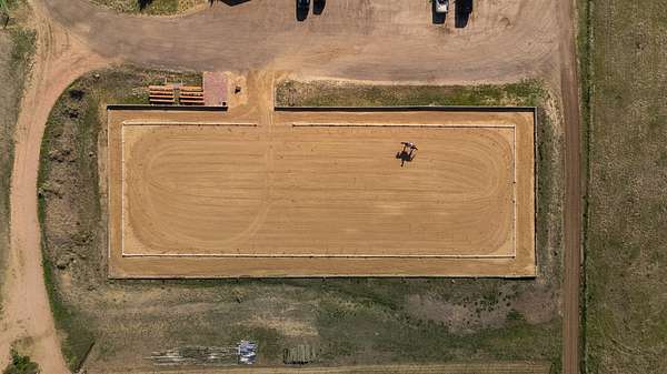 Outdoor Arena (20m x 60m): 10' border, shredded carpet footing, sloped 1.5% for drainage--rideable shortly after rain