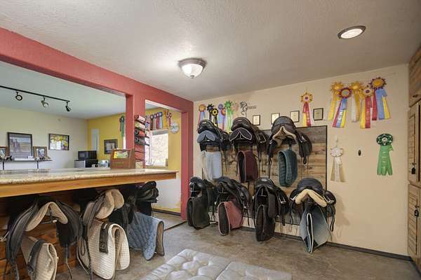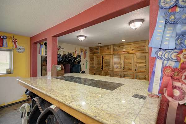 Custom cedar-lined tack room with beetle kill pine cabinetry, granite counters, and 18 personal lockers
