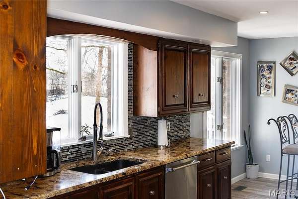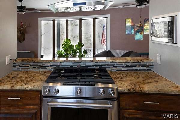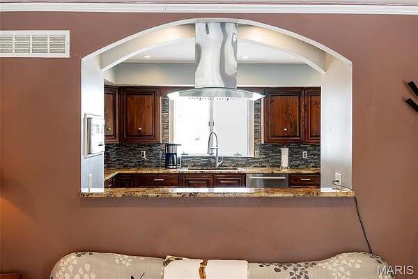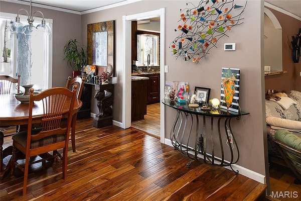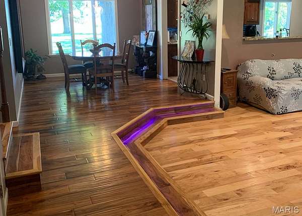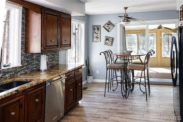 Step inside the tri-level home and be greeted by stunning acacia and hickory hardwood flooring that flows throughout the house. The dining room features a large window overlooking the backyard, while the kitchen offers granite countertops, backsplash, ceramic flooring, pantry, and an large arched window to the living room. Just off the kitchen, the three-season room provides beautiful pond views, windows and screens for summer breezes, and a hookup ready for a hot tub.