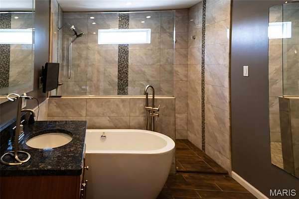 The living room showcases hardwood floors, a fireplace, and a large bay window for natural light. Upstairs, you'll find generously sized bedrooms with ample closet space. The main full bath includes a walk-in stone-floor shower and a soaking tub. The primary suite features hardwood floors, a walk-in closet, and a 3/4 bath with ceramic flooring and granite countertop.