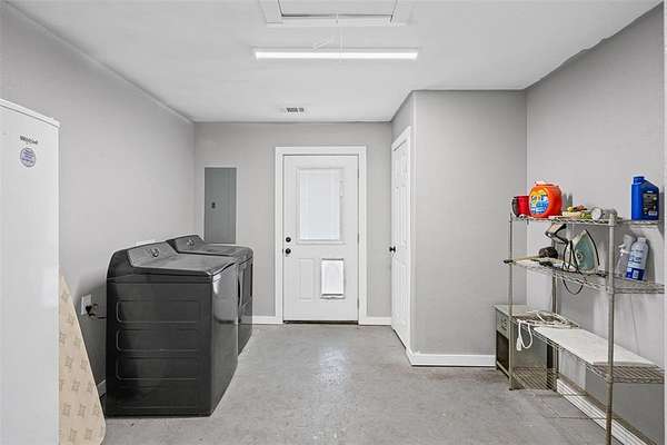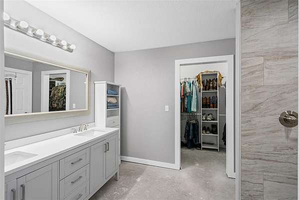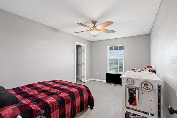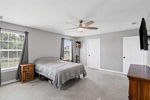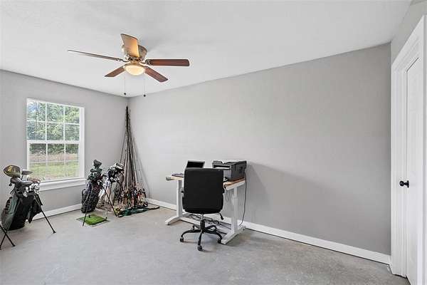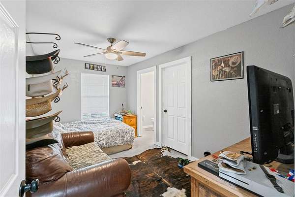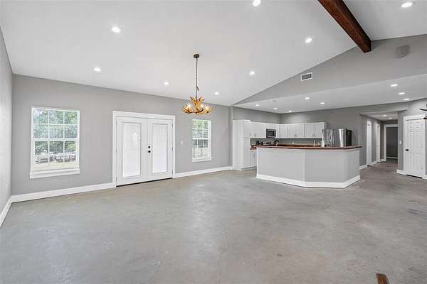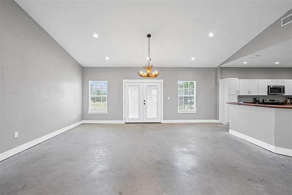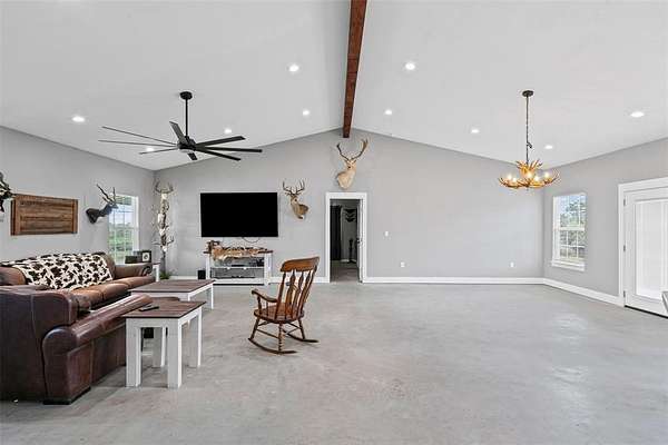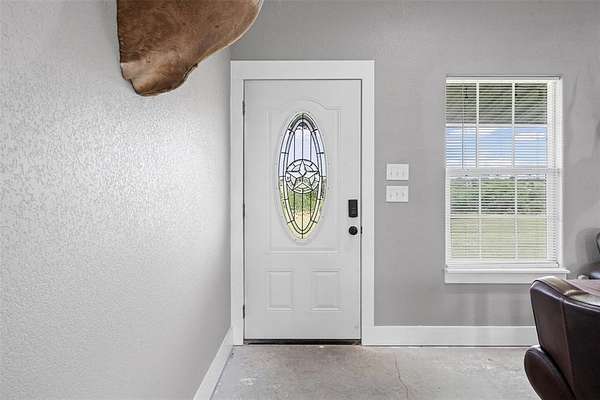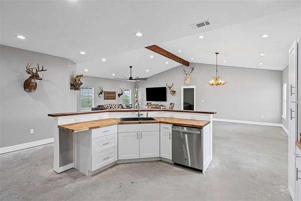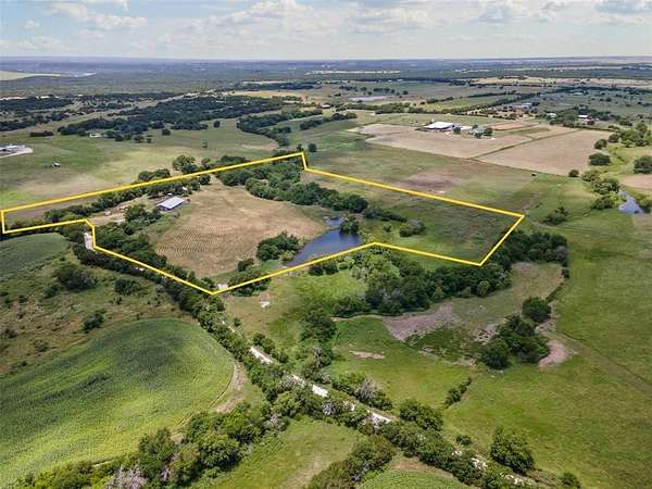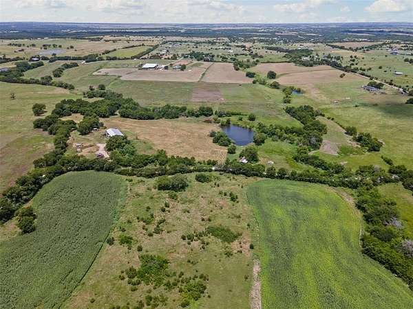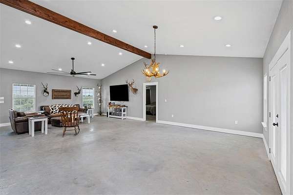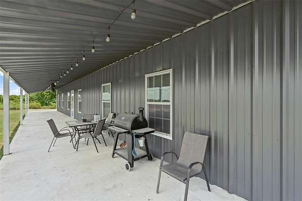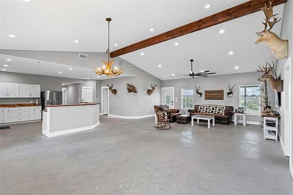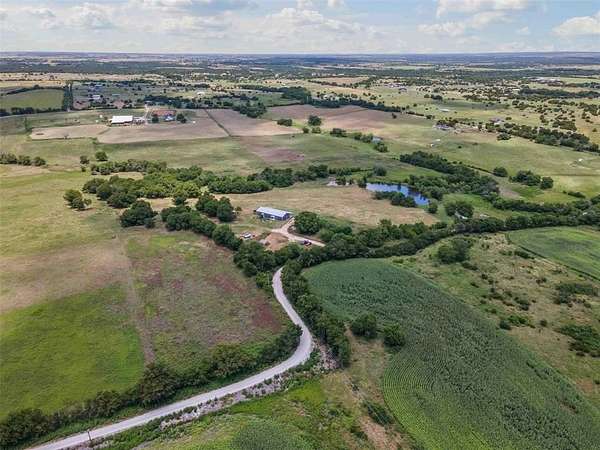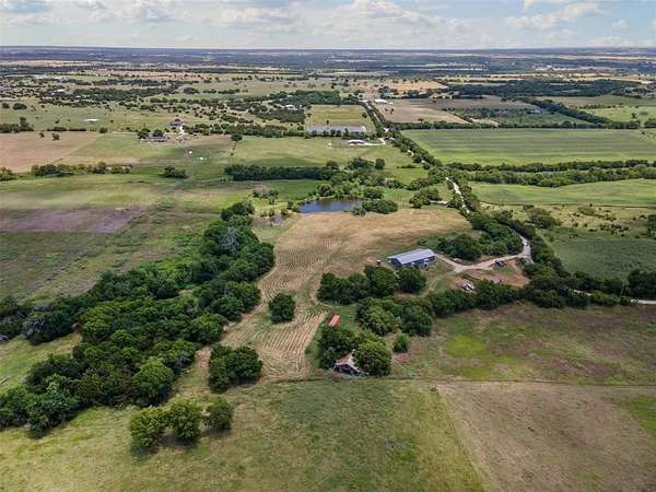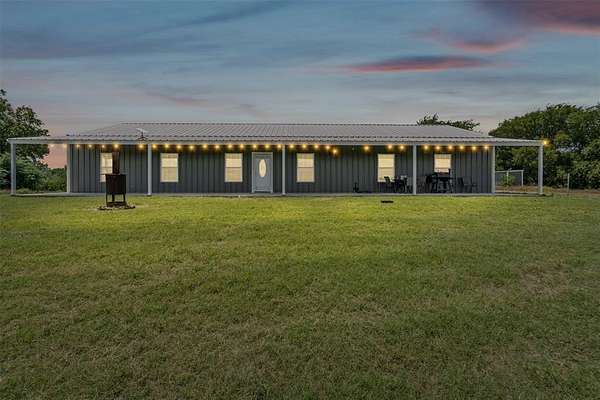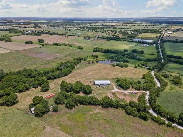 Located in the Blum area of Hill County, this barndominium sits on more than 20 acres with long views over open pastures and a pond, creating a peaceful country setting with easy access to nearby towns and major routes toward Cleburne, Lake Whitney, and the Chisholm Trail Parkway corridor. The covered front porch overlooks the land and offers a comfortable spot for morning coffee, evening grilling, or simply taking in the landscape. Inside, an open living, dining, and kitchen layout features tall ceilings, custom lighting, and a wooden accent beam. The kitchen includes a large island with butcher block countertops and stainless steel appliances. The private primary bedroom has an ensuite bath with dual sinks, quartz countertops, and a tiled walk-in shower. Three additional bedrooms provide flexible use, including one with a half bath and another well-suited for an office. The laundry room offers space for a freezer or drink fridge and opens directly to a fenced backyard. The fully fenced 20+ acres include a deep 487-foot well and aerobic septic system, adding practical value for rural living. This property offers a blend of acreage, views, and everyday functionality in a quiet North Texas setting.