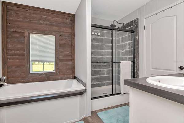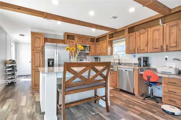 Set on fully fenced and cross-fenced agricultural-zoned land, this 1,140 sq ft home features a split-bedroom layout perfect for privacy. The secondary bedroom and full bath are conveniently located off the entrance, ideal for guests or family. As you step into the open-concept living area, you'll be greeted by beautiful wood plank laminate flooring throughout (with cozy carpet in the bedrooms), a decorative accent wall with built-in electric fireplace, and a stylish kitchen with stainless steel appliances, abundant cabinetry, and designer finishes -- perfect for both everyday living and entertaining.