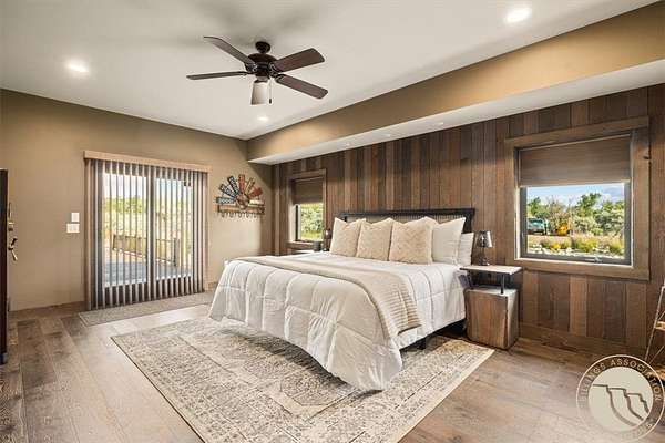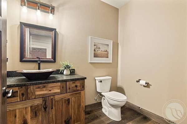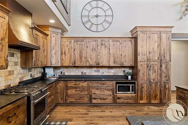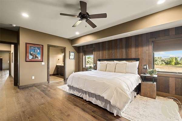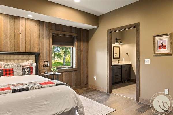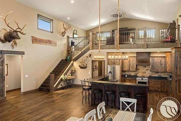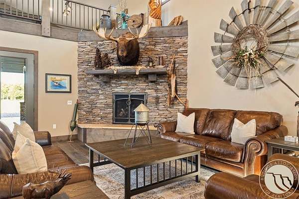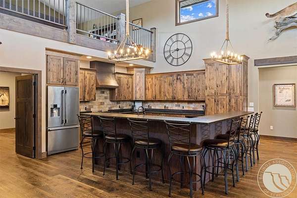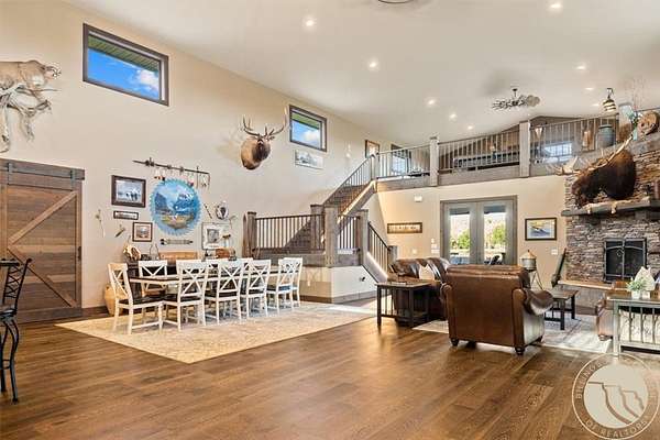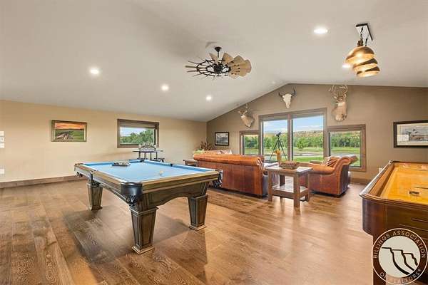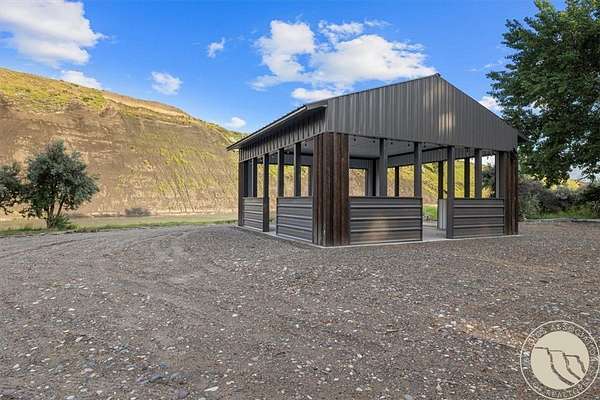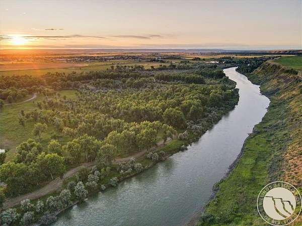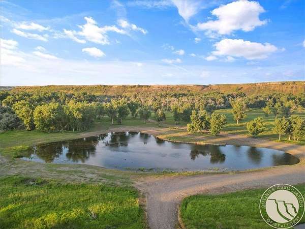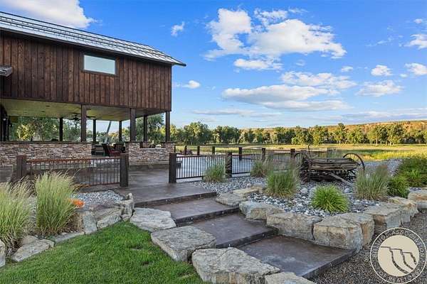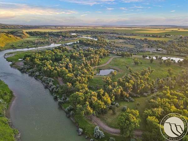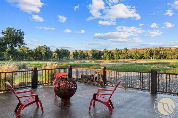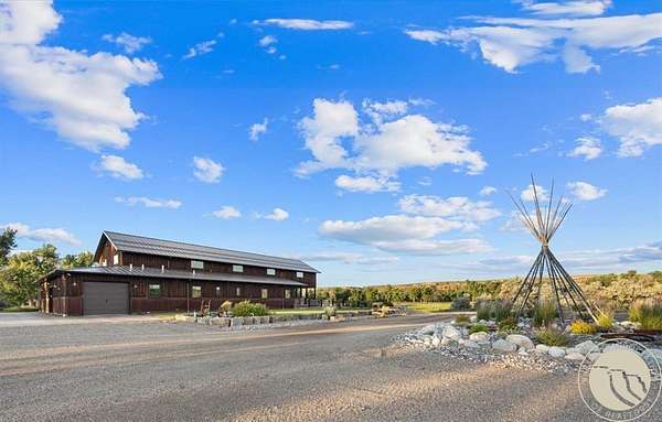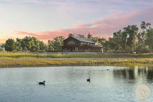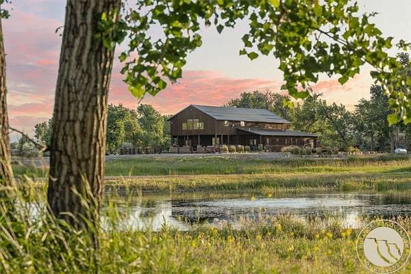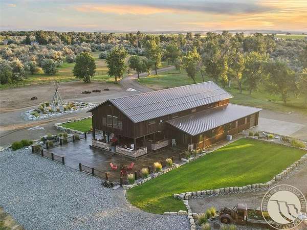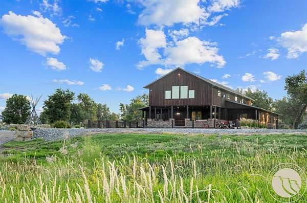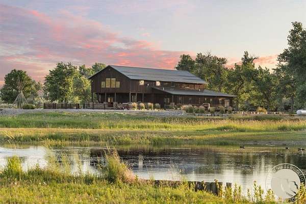 A rare opportunity on the banks of the Big Horn River-this 72.84-acre retreat just 3 miles south of Hardin features this custom home with four spacious primary suites all on the main level for ultimate comfort and privacy. Designed with an open-concept layout, the home boasts vaulted ceilings, hardwood floors, granite countertops, custom cabinetry, and two lofts-one offering sweeping views of the manicured grounds and river. Rustic farmhouse elements blend seamlessly with upscale finishes, including wood siding, a standing seam metal roof, fiberglass windows, tiled tub surrounds, and a stylish half bath. The fully landscaped exterior includes decorative sidewalks, a large patio, and a pavilion by the river. The property offers approximately 1,937 feet of river frontage, two ponds, and over 6,000 feet of private roads and walking paths-ideal for fishing, wildlife viewing, and exploration.