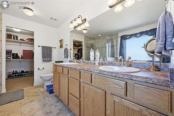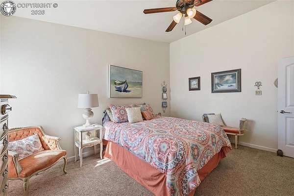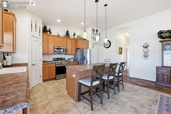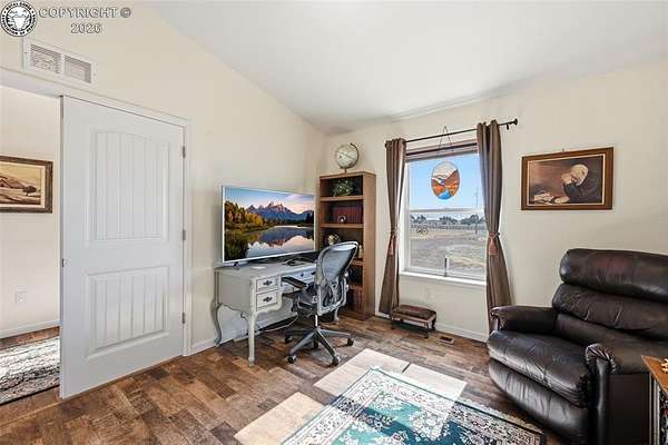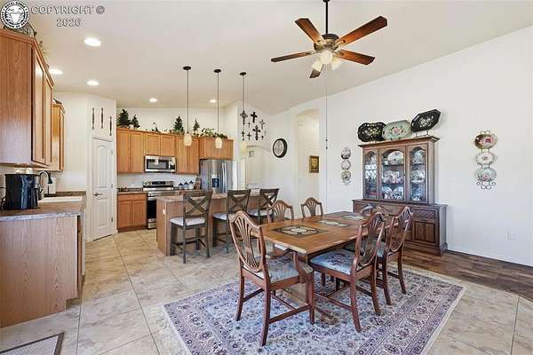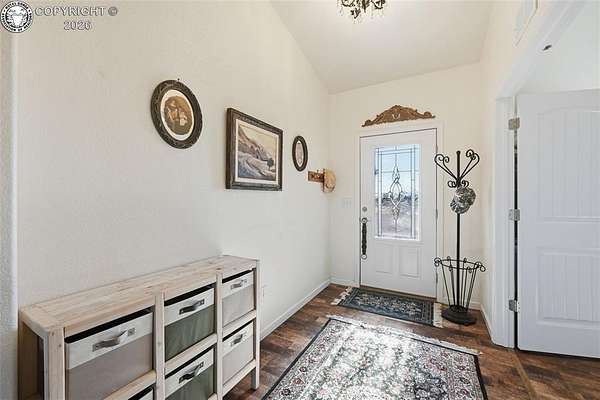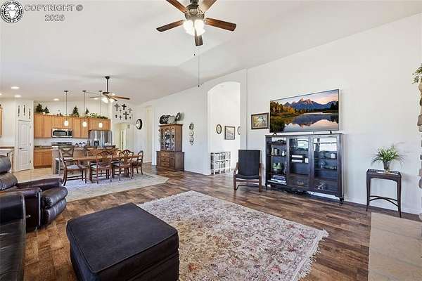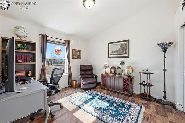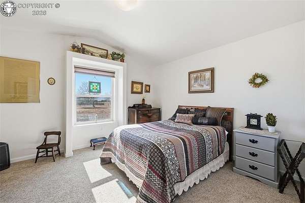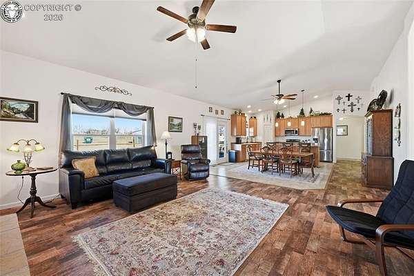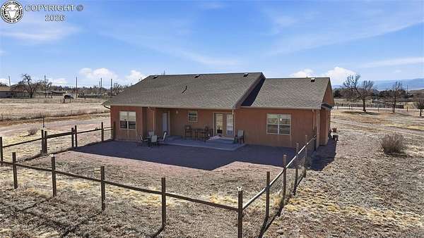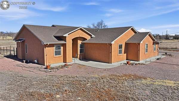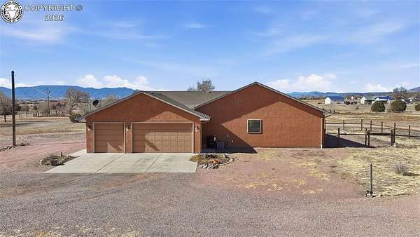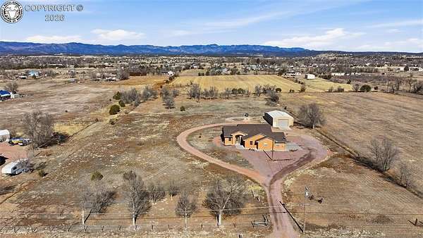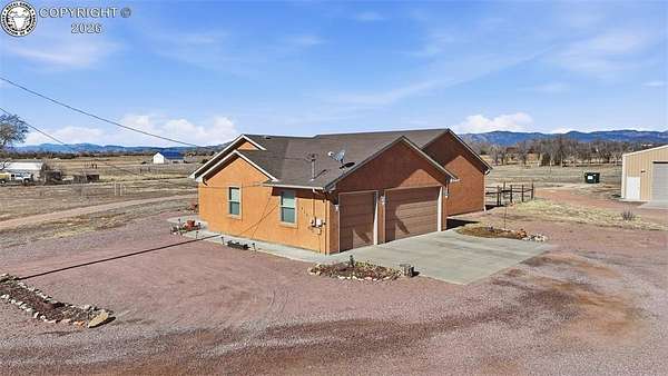 Quality custom home on over 4.4 acres offering peaceful rural living and exceptional privacy, perfectly positioned back from the road. This inviting 4-bedroom, 2-bath home features over 1,950 square feet of thoughtfully designed living space with quality upgrades throughout. A bright, formal entry welcomes you into the expanded living room, highlighted by a beautiful gas-log fireplace, vaulted ceilings, and large windows that fill the space with natural light. The oversized custom kitchen is designed for both function and style, featuring a large prep and seating island, quality custom cabinetry, and a spacious pantry. The open dining area easily accommodates large tables, making it ideal for big gatherings and entertaining. A desirable split-bedroom floor plan offers a spacious primary suite complete with a luxurious 5-piece bath, including large, inviting soaking tub, beautifully tiled walk-in shower, double vanity, and an impressive walk-in closet. The three additional bedrooms feature vaulted ceilings, large closets, and flexibility for those that work from home to have a private office or work space. Car and hobby enthusiasts will appreciate the attached 29 x 29 three-car garage, plus a detached 30 x 48 shop with full concrete floor, 11 1/2-foot main overhead door, and additional side-entry overhead door. An extra 20 x 30 garage provides even more storage and workspace options for tractors and off-road vehicles. All of this sits on a level, fenced 4.4 acre parcel-an attractive and functional property with room to spread out and enjoy the quiet country setting with expansive mountian views of Pikes Peak and the surrounding mountain ranges. Wonderful Property!