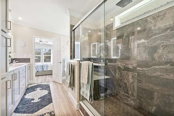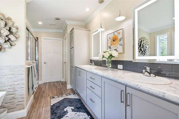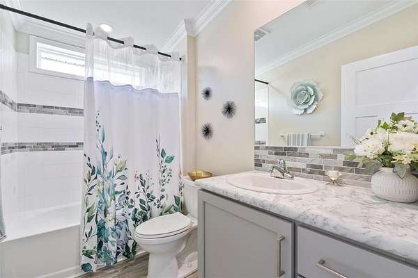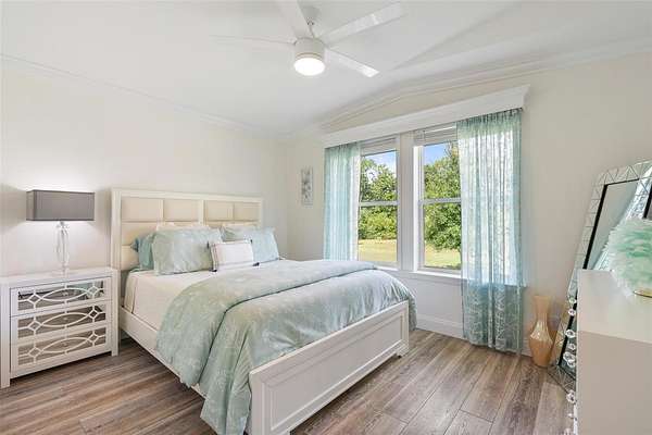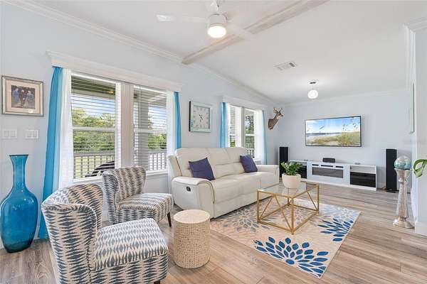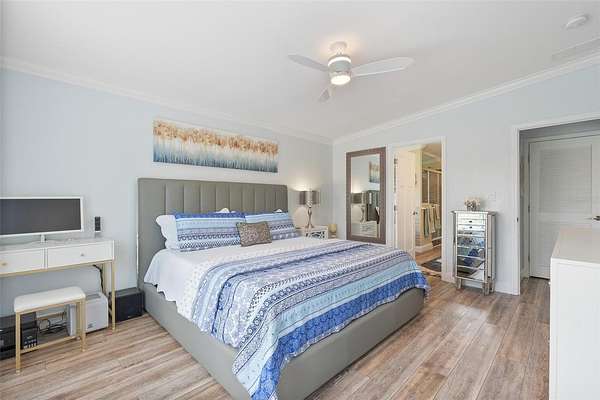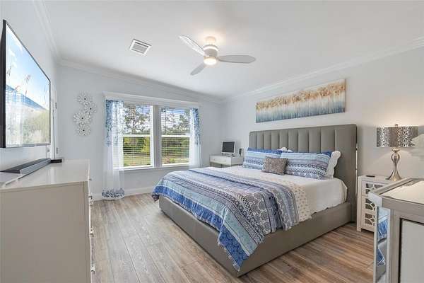 The primary suite offers a large walk-in closet and a spa-like en-suite bathroom with dual vanities and walk-in shower. Two additional bedrooms and a full guest bath make this home ideal for families, guests, or a home office setup. Additional highlights include a dedicated laundry/ mudroom, ceiling fans throughout, and durable, low-maintenance flooring.
