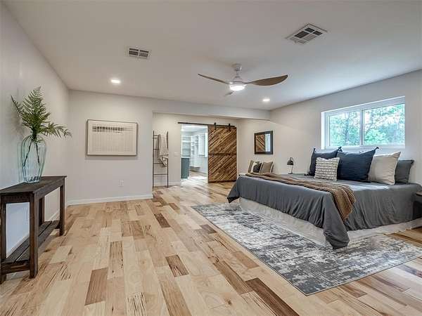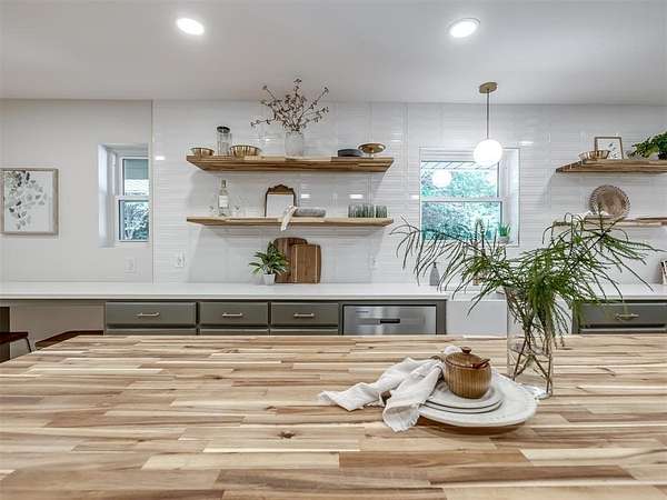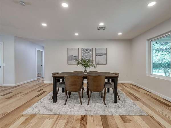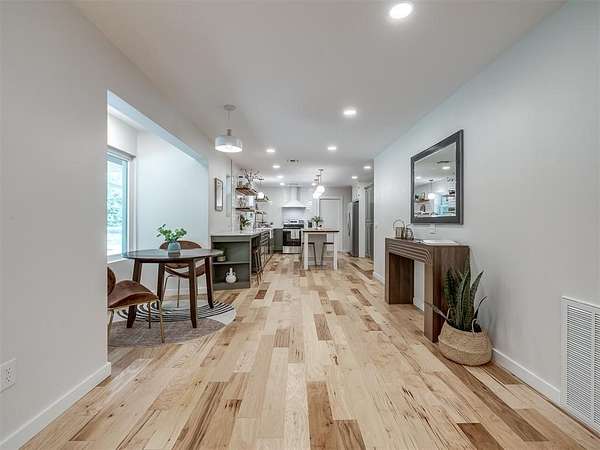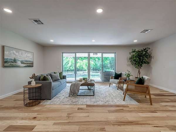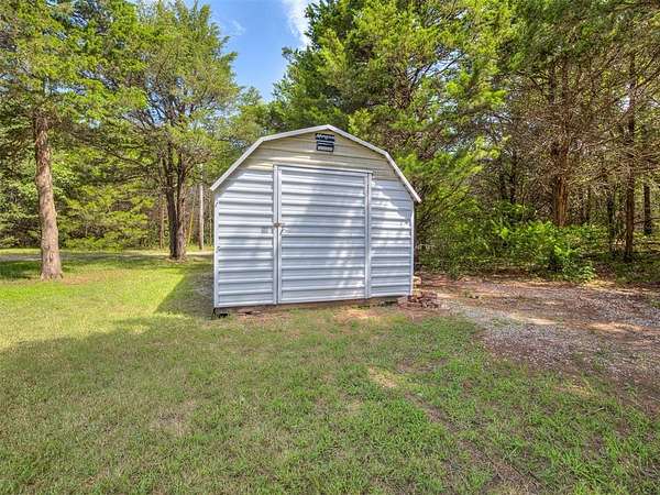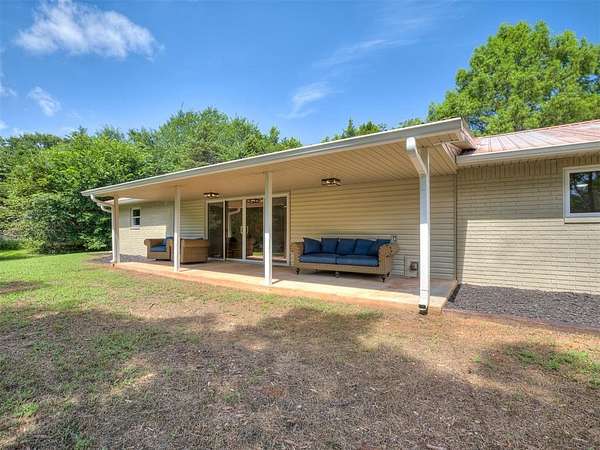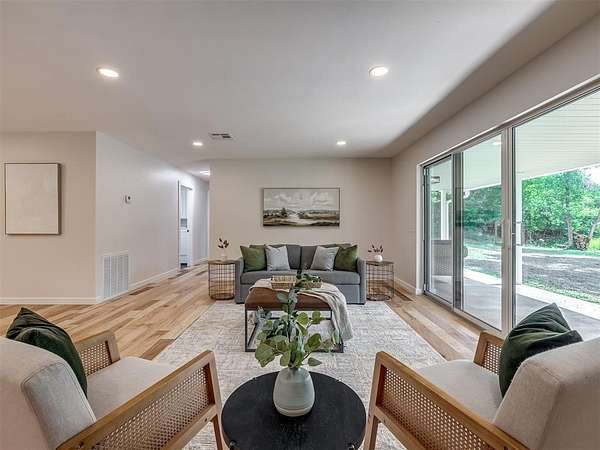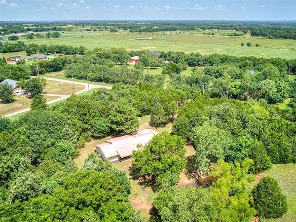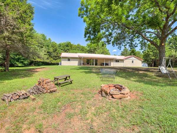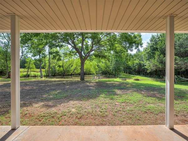Welcome to 8750 Hartman Rd., a fully renovated home nestled on a stunning 3.5-acre lot in Noble. Surrounded by towering mature trees and tucked away for privacy, this property offers tranquility, space, and high-end modern finishes-all just minutes from town. Inside, you're immediately drawn to the expansive 12-foot sliding glass doors that open to a serene backyard with open views of a wildlife-filled pond, fed by a creek, and a majestic pecan tree as its centerpiece. Nearly every surface of this home has been updated. Enjoy new wood floors throughout, level 5 smooth walls in the main areas and primary suite, brand-new windows, fresh interior and exterior paint, new doors, trim, baseboards, switches, and outlets. The custom kitchen features floating acacia shelves, a large 3x8 butcher block island, tile backsplash from counter to ceiling, a farmhouse sink, new lighting, and new stainless steel appliances including oven, dishwasher, refrigerator, and vent hood. Both bathrooms include new countertops, sinks, toilets, plumbing fixtures, and modern design details. The oversized primary suite is a true retreat, with a massive walk-in closet accessed by a custom barn door and a beautifully remodeled en-suite bathroom. New ceiling fans provide comfort throughout, and the large covered back porch is perfect for morning coffee or relaxing evenings while enjoying nature. Located just 9 minutes to downtown Noble, 15 minutes to Lake Thunderbird, and 20 minutes to Norman and the University of Oklahoma. This home offers the best of both worlds-modern living with the peace and beauty of the country. A must-see property and true labor of love!