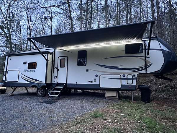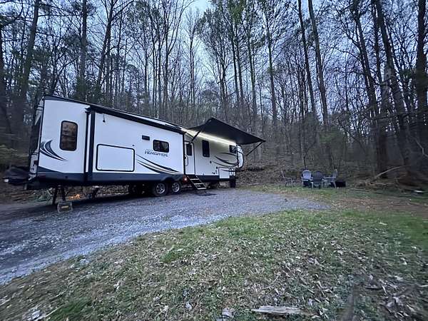 Est $703/mo5.5 ac tract includes utilities, electric and water at road. Septic in place for front RV pad. RV does not convey (can be purchased separately). Well located at top of property. River view from top of property.