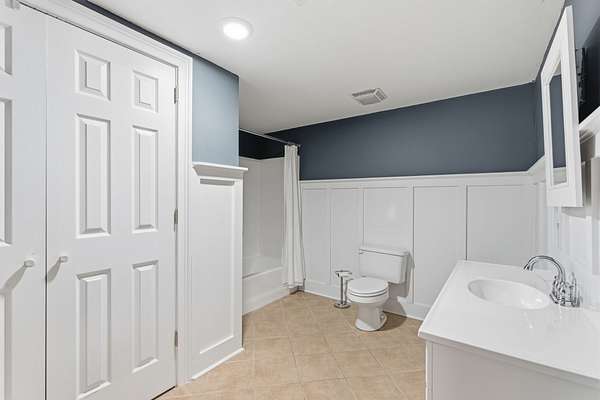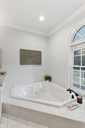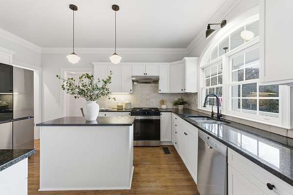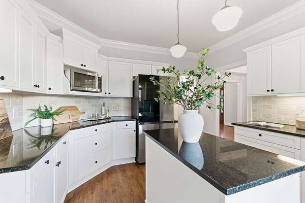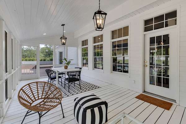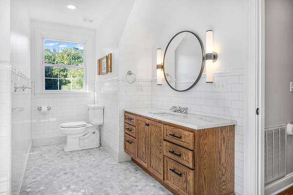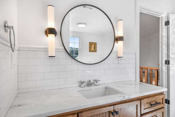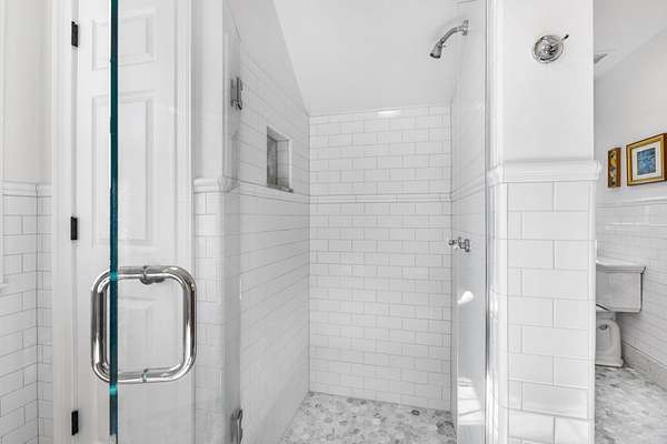 Upstairs, there are two additional light-filled bedrooms & a fully remodeled bathroom showcasing Carrera marble flooring, a custom vanity, walk-in shower, & cast-iron clawfoot tub. Hardwood floors & abundant natural light flow throughout the home.