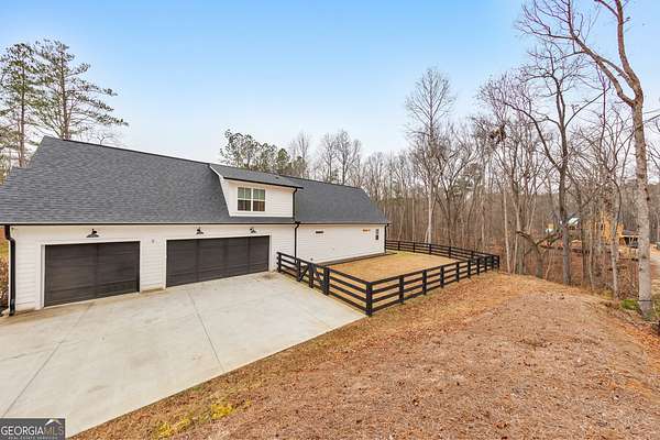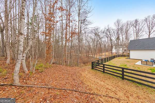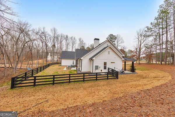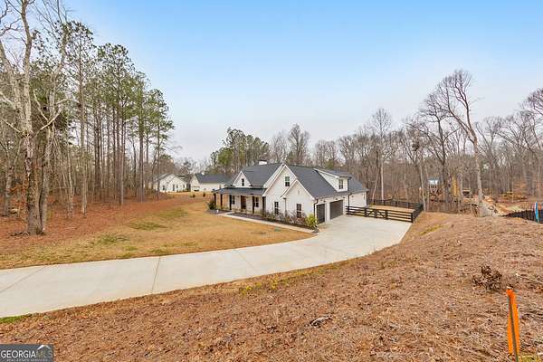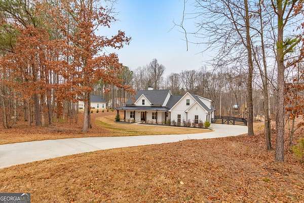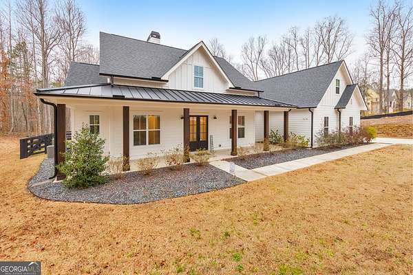 Looking for a home that checks all of your boxes? Look no further! Welcome to this stunning 2023-built modern farmhouse, offering 4 bedrooms and 3 baths on a picturesque 1.5 acre lot in a prime Woodstock location. From the moment you step onto the charming rocking chair front porch, you'll feel right at home. Inside, the open-concept design is filled with natural light, showcasing a bright and airy living space that's perfect for both everyday living and entertaining. The chef's kitchen is a true showpiece with an expansive island, quartz countertops, stainless steel appliances, a farmhouse sink, and a large walk-in pantry. An office sits just off the main living area, providing a quiet space to work from home. The main-level primary suite is a luxurious retreat with a spa-like bath boasting a double shower and dual vanities. The oversized walk-in closet is a dream and connects directly to the laundry room for added convenience. Two additional main-level bedrooms share a beautifully designed hall bath with a double vanity, while a versatile flex room with a dog door to the backyard adds extra function. Upstairs, a private bedroom and full bath create the ideal suite for teens, guests, or extended family. Thoughtful details include 8-foot solid core doors on the main level, soft-close cabinets/drawers throughout, a tankless gas water heater, and a washer and gas dryer included. Outside, the expansive covered back porch and extended patio overlook the level, fenced backyard, providing the perfect backdrop for weekend barbecues, playtime, or simply relaxing while kids and pets enjoy the space. Blending modern luxury with timeless farmhouse charm, this home is designed for comfort, style, and lasting memories. With its incredible features and inviting spaces, it's a place you'll be proud to call home for years to come!