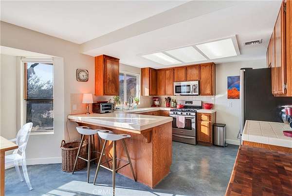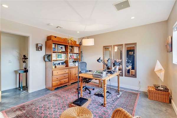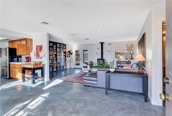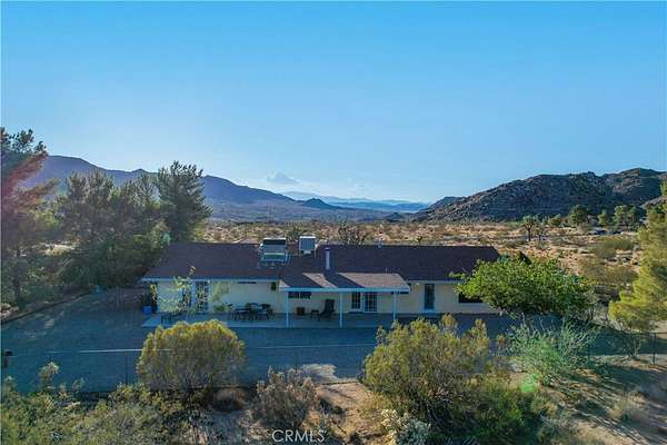 Live your best life in this spacious showplace on 2.5 acres with breathtaking 360 degree mountain views in the coveted Monument Manor neighborhood. Near the west entrance to Joshua Tree National Park, this 1,840 sq. foot 3 bedroom, 2 bathroom, pine shaded oasis offers comfortable and stylish living in a stunning natural environment. An entertainer's delight, this home boasts a generous open floor plan. The chef's kitchen -- featuring stainless steel appliances and a breakfast bar -- opens into a roomy dining nook and vast, inviting living area with a cozy wood burning stove and French doors that open onto the expansive covered patio. The bedrooms are sizable and the bonus room with a private entrance presents space for a yoga room, office, or studio. Among this gem's many charms are gorgeous coated concrete floors, recessed lighting, and ample windows that bathe the space in natural light. Beyond its beauty, this home is very well-suited for practical living, with central HVAC and ducted Mastercool, dedicated laundry area, and 2 car attached garage. Wake to the sound of chattering quail as dawn pinks the horizon and enjoy coffee on the patio. Take a hike in nearby Joshua Tree National Park, and later, enjoy stargazing while listening to coyotes sing. Truly the best deal in the best area. Don't miss this one -- come see today!