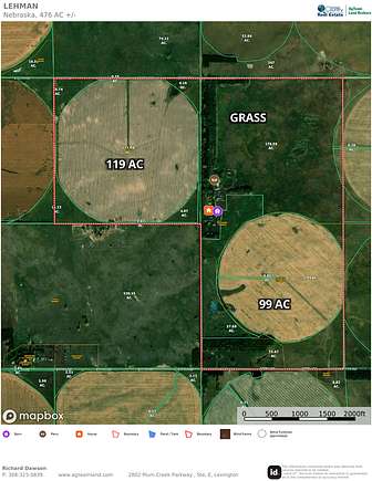 The property is 476 contigious acres. There are two center pivot sprinkler systems irrigating 218 acres of cropland that can be utilized for cash grain, hay, or forage production. Two shallow, unlimited irrigation wells provide the water. There are no pumping restrictions. The corners of the center pivot irrigated cropland are native grassland that can be hayed or Fall grazed with the corn stalks. The remaining acres consists of the building improvements, cattle pens, native grass, and large tree groves and shelter belts. Pride of ownership in every detail.