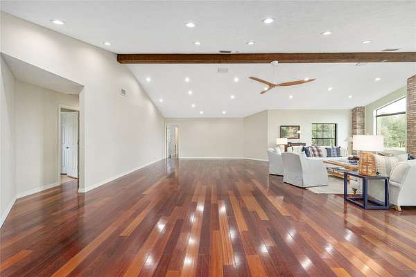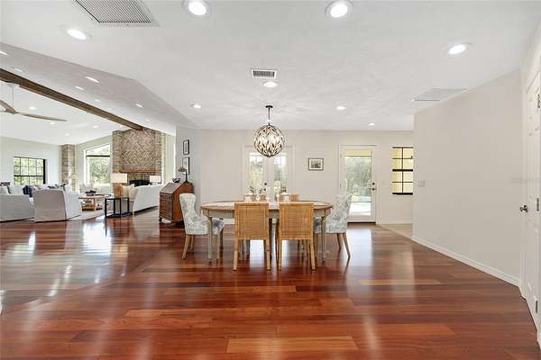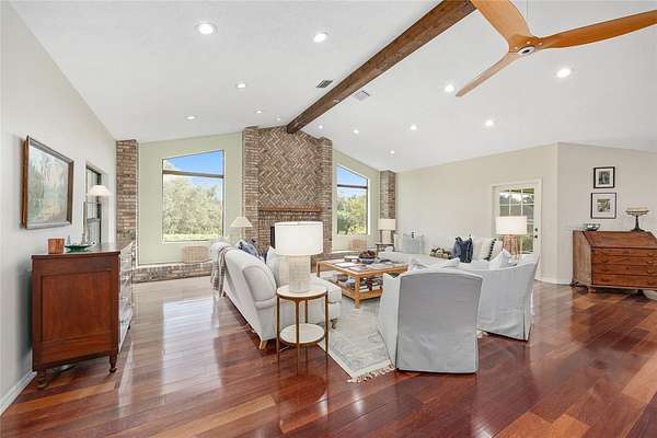 A tree-lined drive leads you through rolling, manicured pastures toward the barn, arena, and home. The residence is surrounded by mature landscaping, with a welcoming front patio and a classic paver walkway that sets the tone right from the start. Inside, the home is light, bright, and recently updated, offering 3 bedrooms, 2.5 baths, plus a den/office. Upgrades include cherry and cork wood floors, fresh finishes throughout, and plenty of natural light.