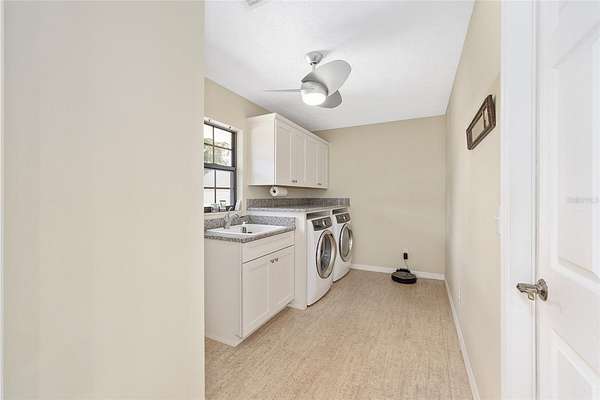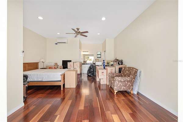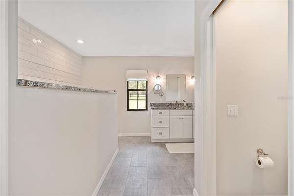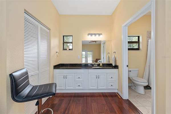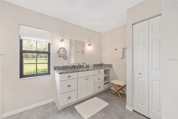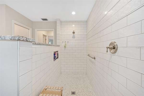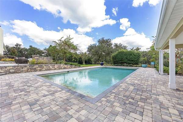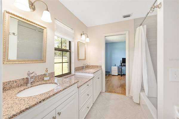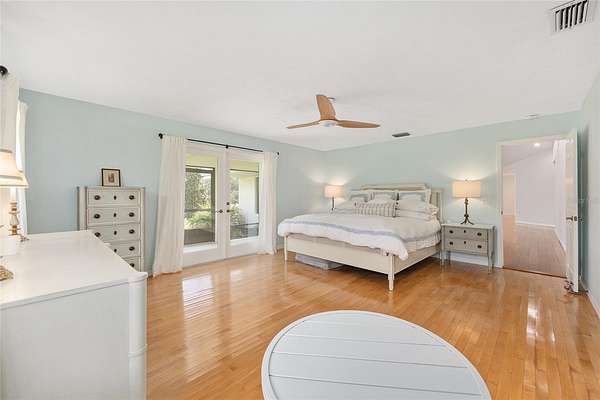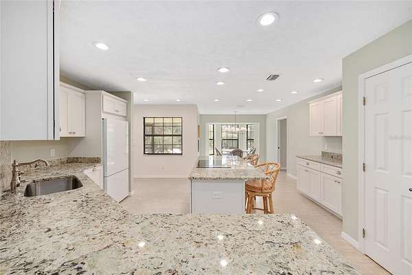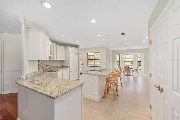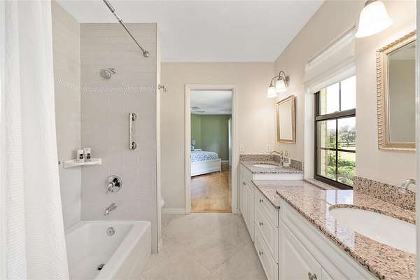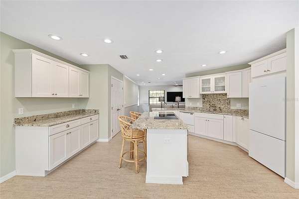 The split-bedroom layout gives guests privacy, with two spacious guest rooms sharing a Jack-and-Jill bath with dual vanities. The main suite stands out with its own screened lanai, two walk-in closets, and a brand-new en-suite featuring granite counters and a walk-in shower. French doors from the kitchen open to a screened patio and the resort-style pool area beyond surrounded by lush gardens, paver walkways, and built-in seating for relaxing or entertaining.