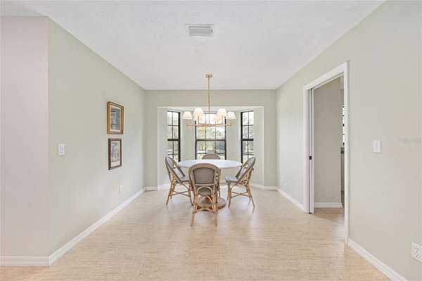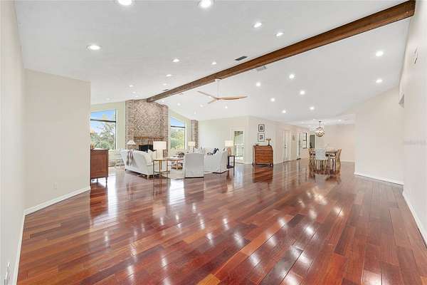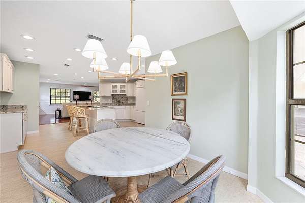 The great room was designed for comfort and entertaining, with cathedral ceilings, large windows, and a floor-to-ceiling wood-burning fireplace. The kitchen has been completely redone with custom cabinetry, premium appliances (GE Profile range with air fryer, Fisher & Paykel fridge and dishwasher, and Viking microwave), a center island with breakfast bar, and a charming breakfast nook with bay window views overlooking the pool.