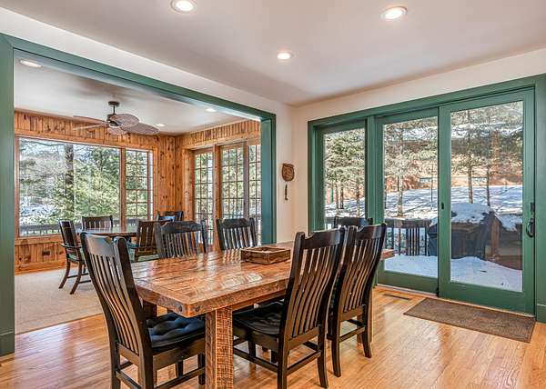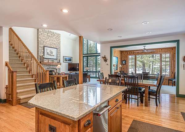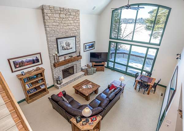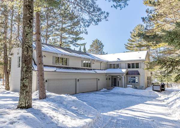 Lake Minocqua retreat just waiting for its new owners! Situated in a quiet bay, this custom-built home offers ample living and garage space. Exceptional southwest lake views offer ultimate lakeside living with amazing sunsets. Set on 114' of shoreline with level lake frontage and effortless access to the boathouse with track system and permanent pier. This 5500+ sq ft house was designed for gathering and entertaining, featuring expansive living areas with soaring 20' ceilings and walls of windows flooding home with natural light. Main level offers open concept living space and spacious primary suite. Loft offers 2 bedroom suites and office with game room and fourth bedroom above the garage. Walkout lower level features a family room, fifth bedroom and bathroom. 4-car heated, attached garage plus the 4-car detached garage with heated workshop and bathroom. The Minocqua chain provides access to nearly 6,000 acres of water for boating, water sports and fishing. Lake life starts here!