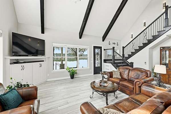 Set on the peaceful west side of PK, this property sits on 1.5 acres of secluded waterfront providing outstanding privacy, calm DEEP waters and expansive open lake views. The property is thoughtfully arranged to highlight outdoor living with tiered terraces, shaded gathering areas and stone pathways that lead naturally to the waters edge, a multilevel private dock serves as the centerpiece of lake life. The dock features 2 boat slips, 1 personal watercraft slips & generous covered, open areas designed for relaxing or entertaining family & friends, Completed in 2022, the custom built home offer a modern open layout that connects seamlessly to the outdoors. The main living area features soaring ceilings, expansive windows framing the lake, statement lighting and a centrally located wood-burning stove. The chef's kitchen is designed for gathering after long days on the water & includes premium stainless steel appliances double refrigerator & ovens, abundant cabinetry & ample storage. The main level includes a spacious primary suite with a soaking tub, walk-in shower & separate closets, along with a guest bedroom full bath & utility room. Upstairs, a loft overlooks the living area accompanied by 2 additional bedrooms, a full bath and generous storage. An unfinished attic space offers flexibility for future expansion. This private peninsula property delivers a rare opportunity to enjoy P K Lake at its finest- combining privacy, modern luxury, protected waterfront & spaces designed for true lake living.