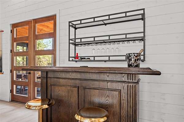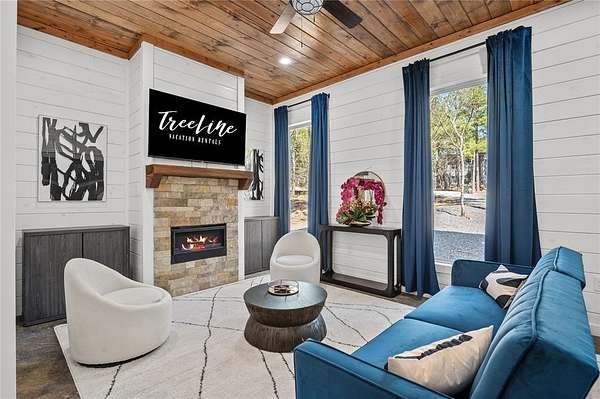 Step inside to an expansive open-concept living area where soaring ceilings, a dramatic floor-to-ceiling fireplace, and oversized windows showcase the beauty of nature. The fully stocked kitchen is a chef's dream, featuring modern stainless-steel appliances, a spacious island, and everything you need to prepare and share meals together. Gather around the large dining table or sip morning coffee on the deck while soaking in the peaceful forest views.