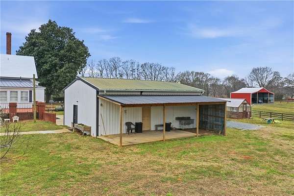 Turnkey hobby farms like this are rare - and this beautifully updated 1887 farmhouse is completely move-in ready. Blending historic charm with modern upgrades, the property is conveniently located just minutes from I-75 for an easy drive to Macon or Atlanta. Wide front porches set a welcoming tone, while inside you'll find soaring ceilings, hardwood floors, and an oversized kitchen with abundant storage flowing into a grand dining space perfect for gathering. The main-level primary suite offers comfort and convenience, with two additional bedrooms, a bonus room, and a full bath upstairs. Recent improvements, including a tankless water heater and brand-new Berridge Victorian metal shingle roof, allow you to settle in with confidence. A detached three-car garage provides excellent space for vehicles, equipment, golf carts, or ATVs. Situated on five flat, usable acres with fenced pastureland, this property is ready to support hobby farming, homesteading, or small-scale agricultural pursuits. Raised garden beds with irrigation and a Yoderbilt greenhouse equipped with electricity, water, and gas heat make year-round growing easy. Mature fig and pecan trees, blueberries, and muscadine vines enhance the landscape. A new 20x40 metal barn, workshop areas, and multiple outbuildings offer outstanding storage and flexibility for tools, machinery, livestock, or projects - everything you need to live the farm lifestyle from day one while enjoying the peace of your own private retreat.