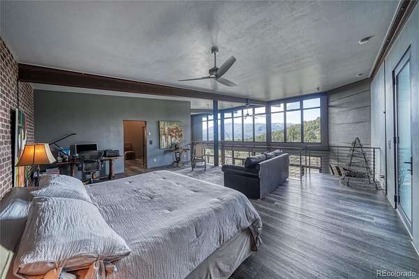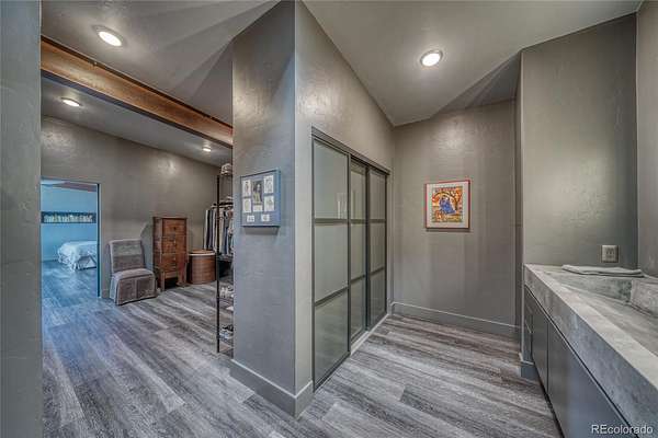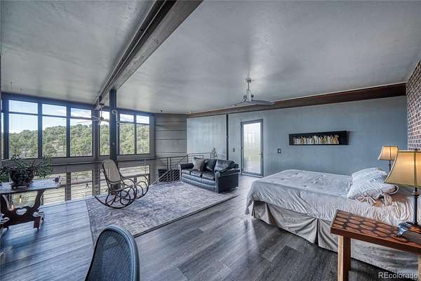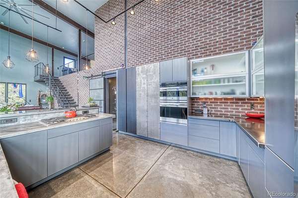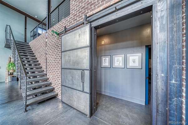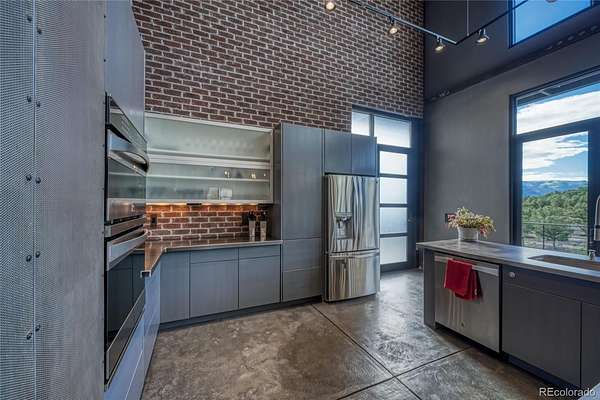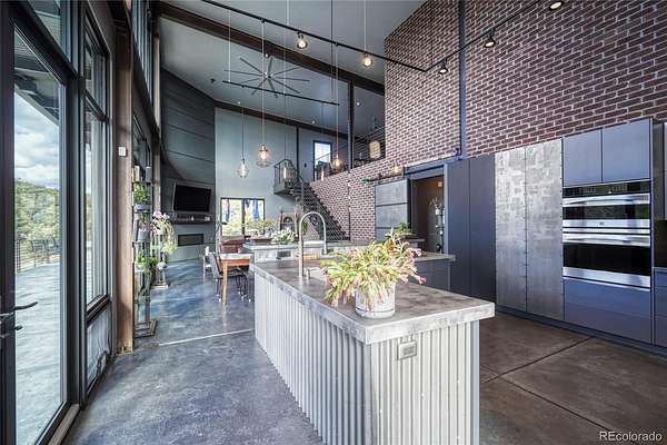 Distinctive features add warmth and character, including exposed brick from historic downtown Salida, steel beam construction, oversized front door, custom metal barn door, and a thoughtfully designed fireplace. The staircase showcases a handcrafted double-wrap railing, while custom mirrors, inventive LED lighting, and curated finishes continue throughout.