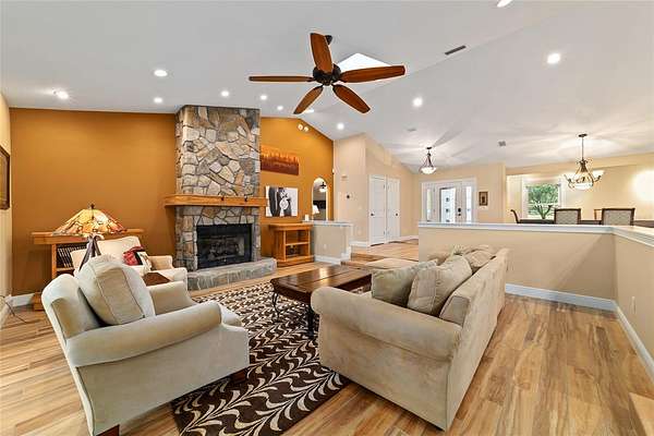 Inside, the single-story home welcomes you with an airy, open layout featuring vaulted ceilings, elegant porcelain tile floors, and an abundance of natural light streaming through skylights. The spacious living room centers around a stunning gas fireplace, creating a warm and inviting atmosphere. The chef's kitchen offers generous cabinetry and counter space, premium JennAir stainless appliances, a center island with cooktop, and a well-organized pantry. Home complete with an electric fire pit & regular fire pit on the patio.