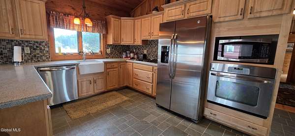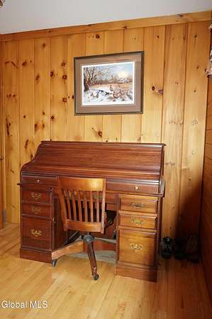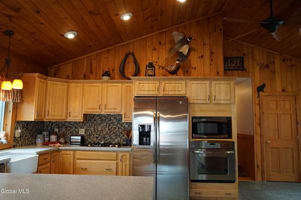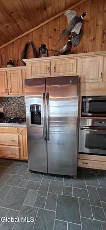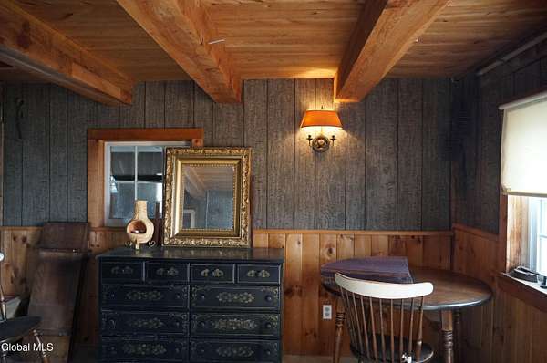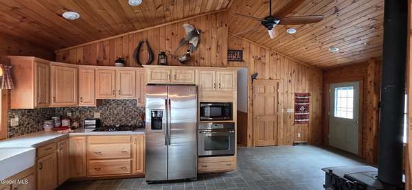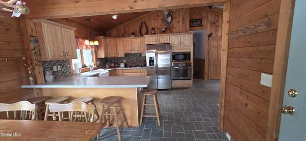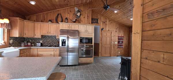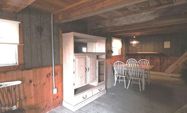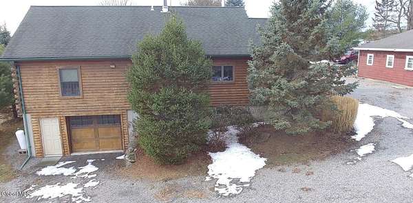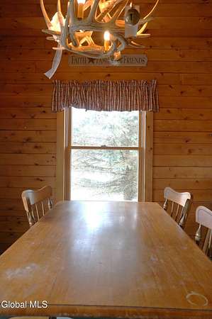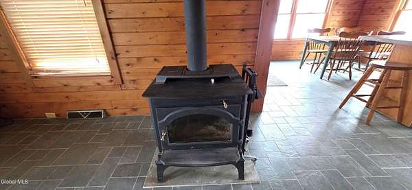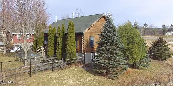 Welcome to this beautiful Cedar Log, single level home offers 3 bedrooms, a wonderful open floor plan with cathedral ceilings in the kitchen and living areas; nice sized living room with a wood burning stove for those chilly evenings, hardwood and Vermont slate flooring, ceramic tiled bath with oversized, tiled step-in shower (w/glass doors). There is a full, partially finished, walk-out basement with access to the attached, oversized garage. The barn is equipped with electric, water, laundry hookups and partial bath which makes it perfect for use as a workshop, storage space or, with a little work, even a private place for your guests! Additional features include: the fenced yard with storage shed and an oil-fired furnace to keep things warm. You'll have direct access from the living room to the fenced area, with patio, for ease of entertaining and letting the dogs and kids out without worry. This home is only 17 years young and is situated on 6.9 rolling private, peaceful acres with the 8 Mile Creek running through and mountain views.