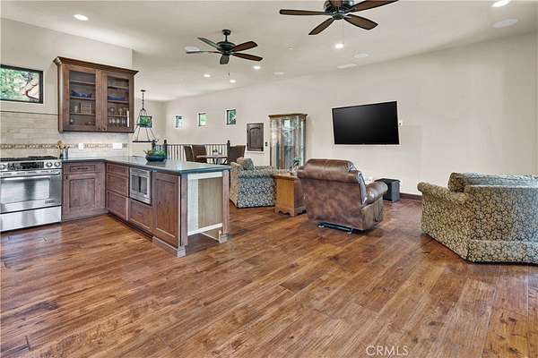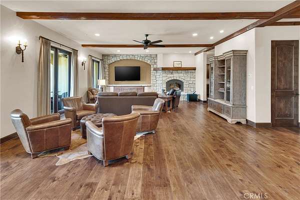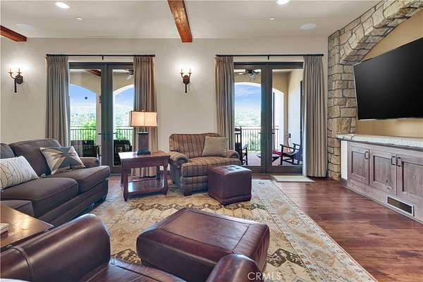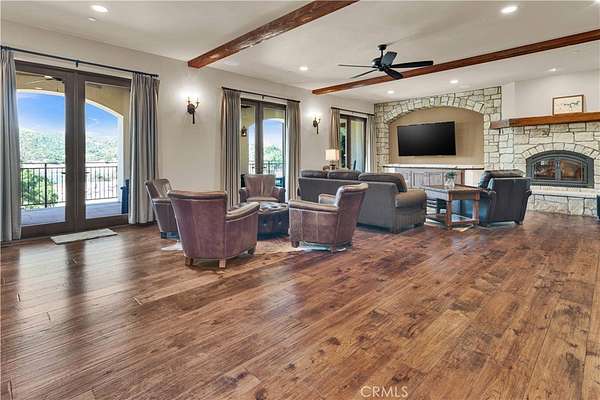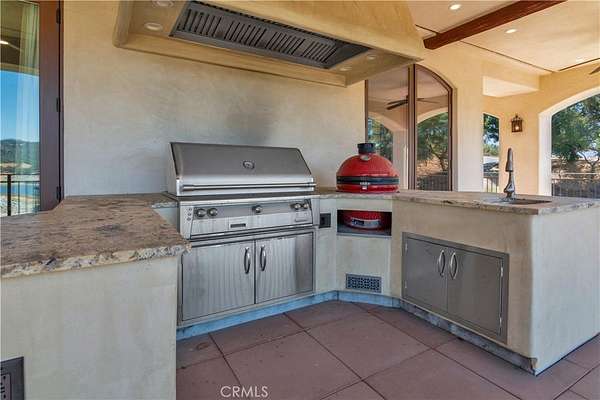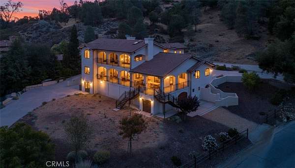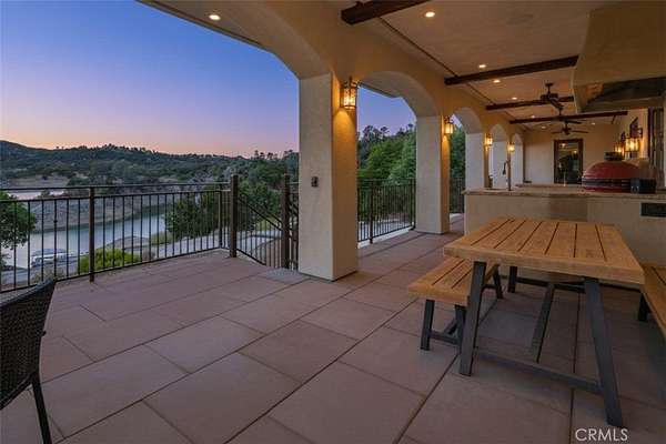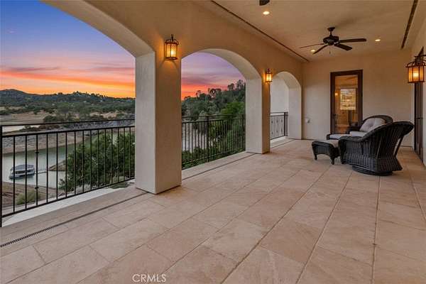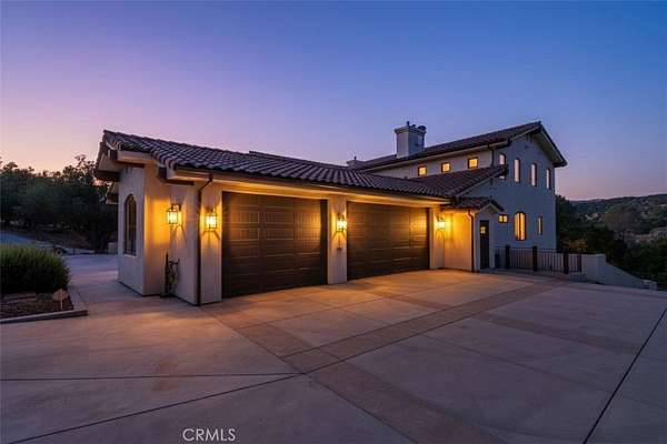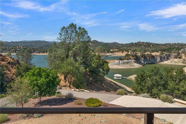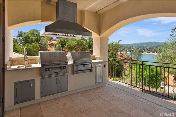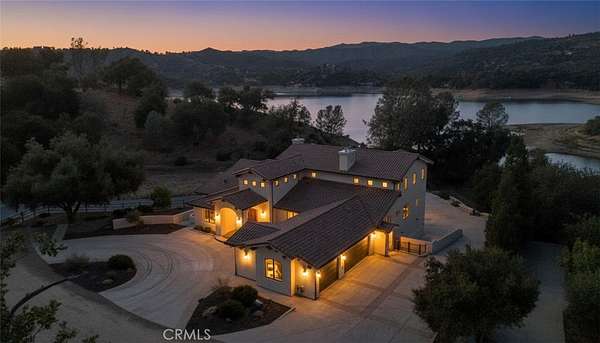 Vacation where you live! Perched on the highly sought-after Cantinas Point in the gated community of Oak Shores at Lake Nacimiento, this expansive 2+ acre lakefront estate seamlessly blends luxury, comfort, and functionality. With 5 bedrooms, 4 full bathrooms, and 2 half bathrooms, the home is thoughtfully designed for both entertaining and everyday living. The main level welcomes you with a flexible floor plan. An office with built-in storage provides the perfect workspace, while the gourmet kitchen features granite countertops, stainless steel appliances, a walk-in pantry, and utility closet. The breakfast nook connects effortlessly to the formal dining area with a fireplace, flowing into the spacious living room anchored by a second fireplace. French doors open out to a sweeping deck with a complete outdoor kitchen and paver system decking ideal for gatherings with family and friends. This level also includes a half bathroom, three guest bedrooms, a full bathroom, and a fourth bedroom with en-suite bathroom, plus a laundry room and four-car garage. The upper level offers added versatility with a full kitchen, dining area, and living room with French doors opening out to a second outdoor kitchen and deck overlooking the lake. The luxurious primary suite is also upstairs, offering a lake view, a walk-in closet, and spa-like en-suite bathroom with dual vanity, soaking tub, and tiled shower stall with seven shower heads. A climate-controlled stairwell from the main to the lower-level doubles as a wine cellar, and a dumbwaiter services all three floors for convenience. The lower level is designed for recreation and future customization, featuring a spacious game room equipped with a fireplace, plumbing, electricity and a chase for additional cooking options, a full bathroom, and a half bathroom. With built-in soundproofing and spray foam insulation throughout the home, this level also offers the opportunity to add a theater room, bunk room, or extra bedroom. Parking is made easy with the concrete driveway, attached 4 car garage and carport with an outdoor shower and setup to wash off your lake toys. Crafted with attention to detail and modern conveniences throughout, this remarkable property offers the ultimate lakefront lifestyle at Lake Nacimiento.