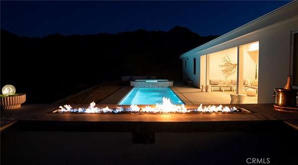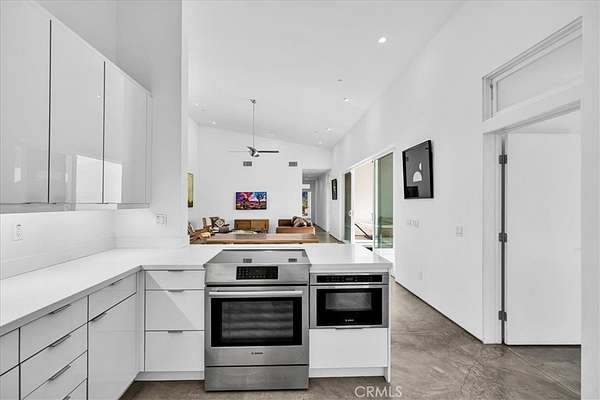 The landscaping is a work of art, featuring native species such as mesquite trees, yuccas, Joshua trees, ocotillos, acacia, and palo verde--all enhancing the sense of harmony with the natural surroundings. Inside, the home showcases sleek concrete floors, soaring ceilings, and 8-foot exterior doors that invite light and air throughout the open-concept floor plan. The expansive living and dining areas flow effortlessly into a custom-designed kitchen equipped with high-end Bosch appliances, an induction cooktop, a water filtration system, and custom cabinetry tailored for those who love to cook and entertain.