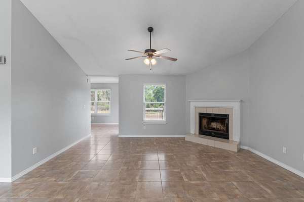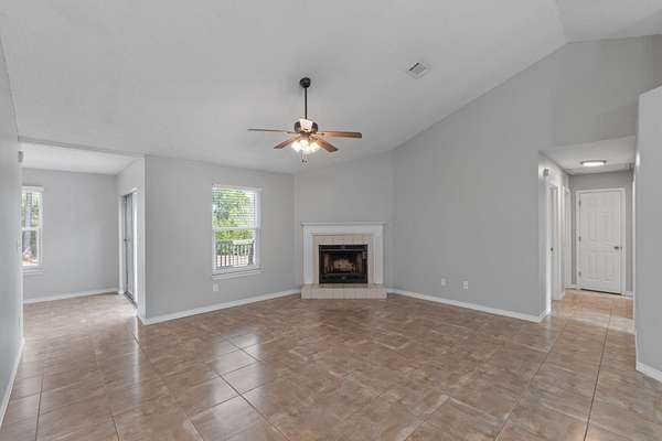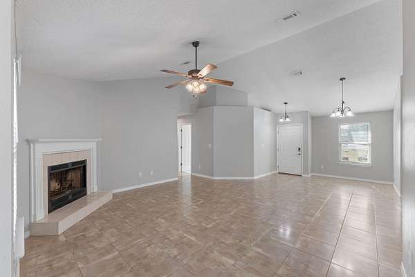 - Ceiling Raised, Fireplace, Floor Tile, Washer/Dryer Hookup, Window Treatmnt Some