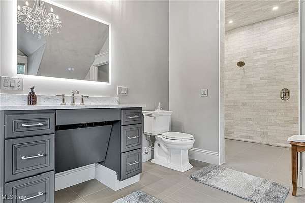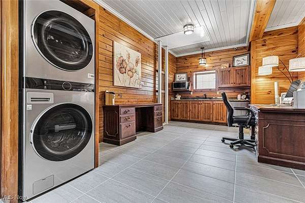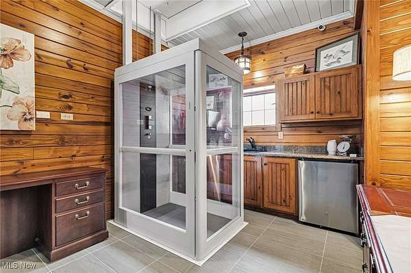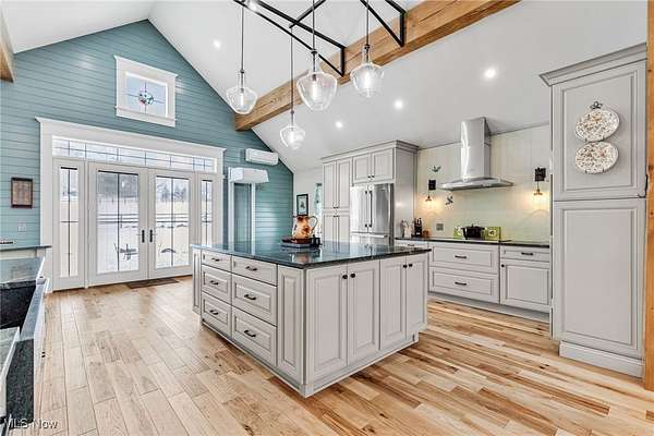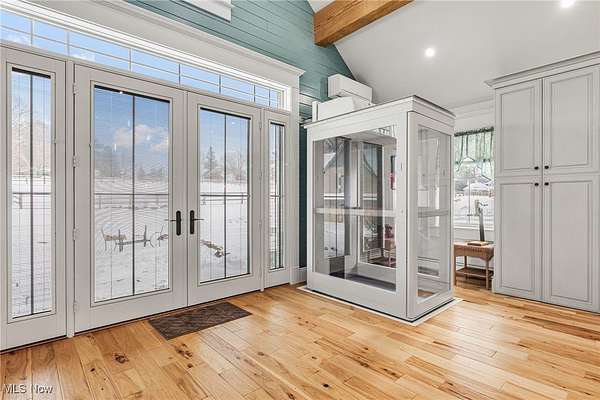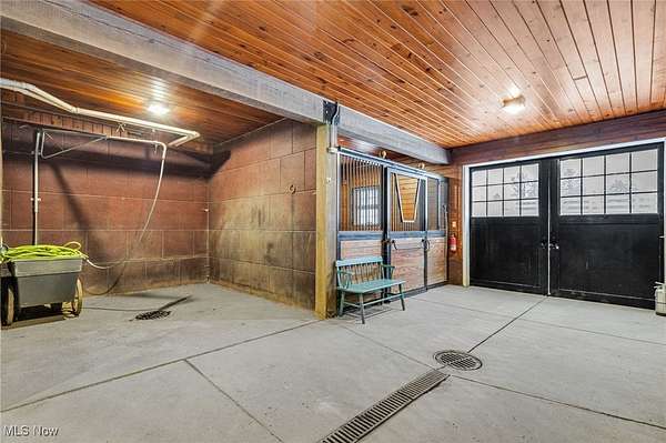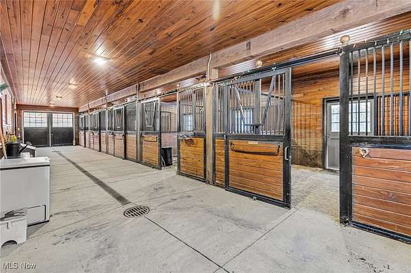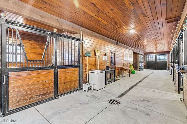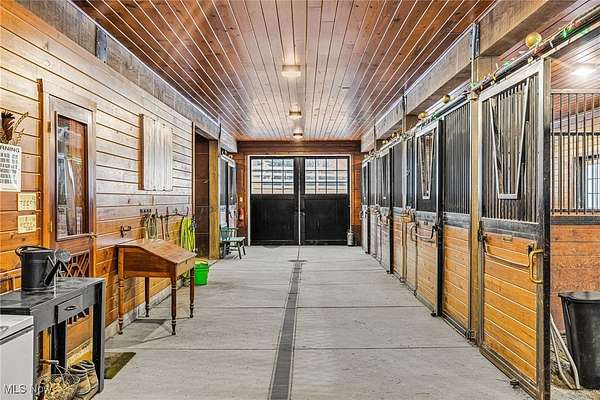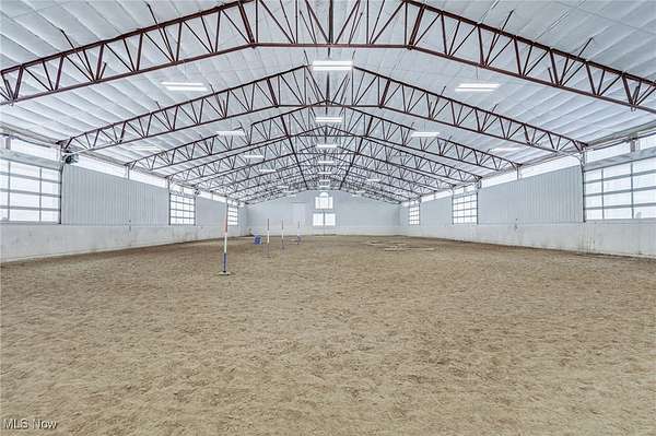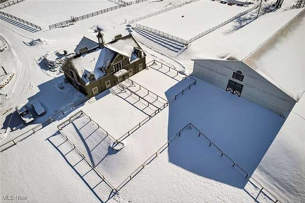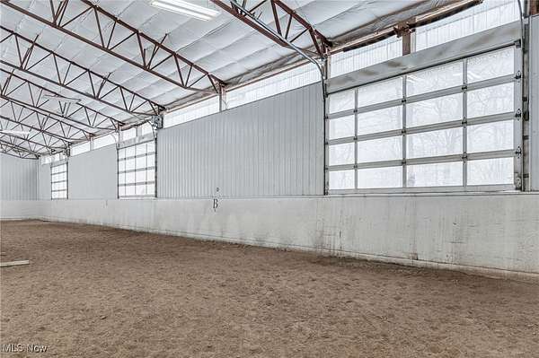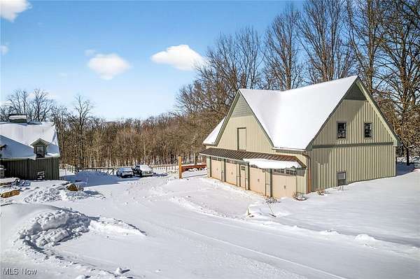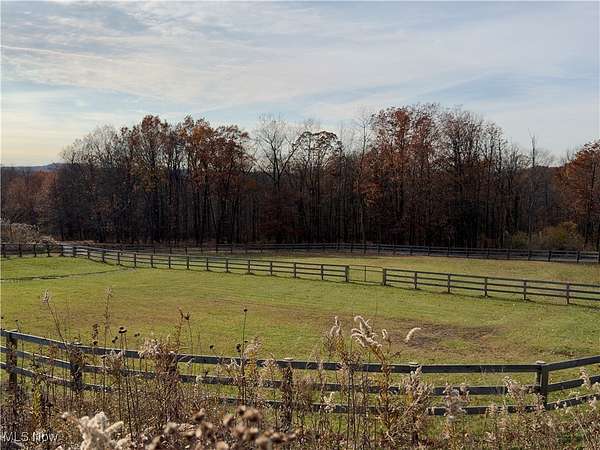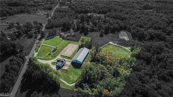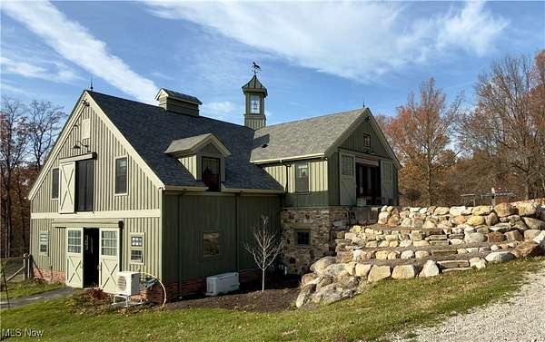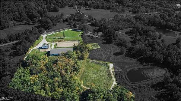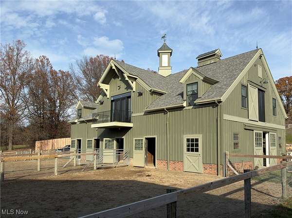 Perched at one of the highest elevations in Geauga County and bordering the Holden Arboretum, this exceptional equestrian estate offers panoramic views, remarkable privacy, and direct access to miles of scenic riding trails from the property. Located in Chardon and in Chardon schools, it combines everyday convenience with a country lifestyle. The Tony Paskevich designed residence has been extensively renovated with luxury, comfort, and long-term livability. A new elevator allows for effortless movement throughout the home. Vaulted ceilings with exposed beams, custom architectural details, and an abundance of natural light define the interiors. The chef's kitchen features custom cabinetry, an expansive green soapstone island, artistic tilework, and hand-scraped hickory floors. Spa-inspired bathrooms include an 8 x 6 zero-entry shower and a soaking tub, blending elegance with thoughtful design. The equestrian facilities are purpose-built for daily function and year-round use. The 7-stall barn offers direct turnout access from five stalls, a dedicated wash bay with integrated drainage. All pastures are enclosed with newly installed three-rail fencing, providing durability & safety. A newly constructed oversized 50' x 30' four-car garage with an upper-level hay loft complements the barn and offers exceptional storage and operational efficiency. Anchoring the property is a fully insulated, steel-trussed 100x180 indoor riding arena designed to accommodate multiple disciplines. A full perimeter of see-through garage doors fills the space with natural light and, when opened, creates a rare indoor-outdoor riding experience ideal for Northeast Ohio's seasons. Additional highlights include a thoughtfully designed garden area featuring a waterfall, koi pond, greenhouse, red cedar raised beds, and newly planted fruit trees. This is a rare opportunity to own a comprehensively designed estate where luxury living, accessibility, and equestrian excellence exist in seamless balance.