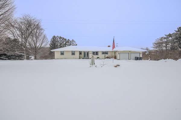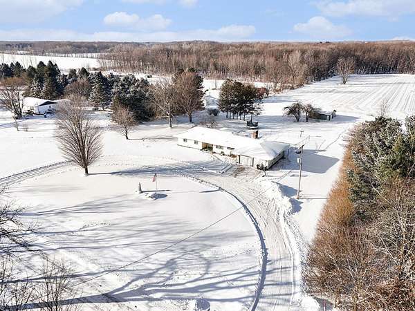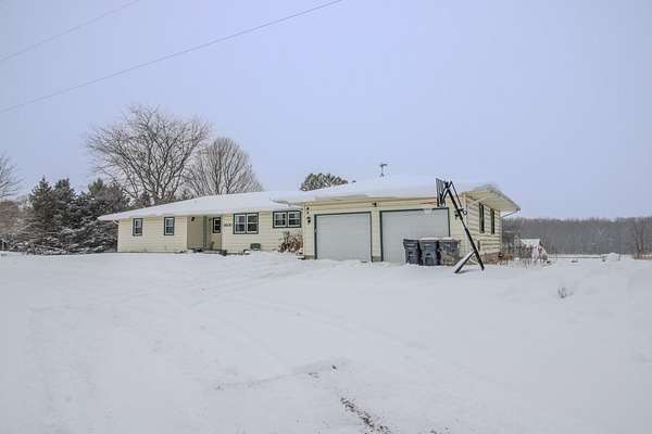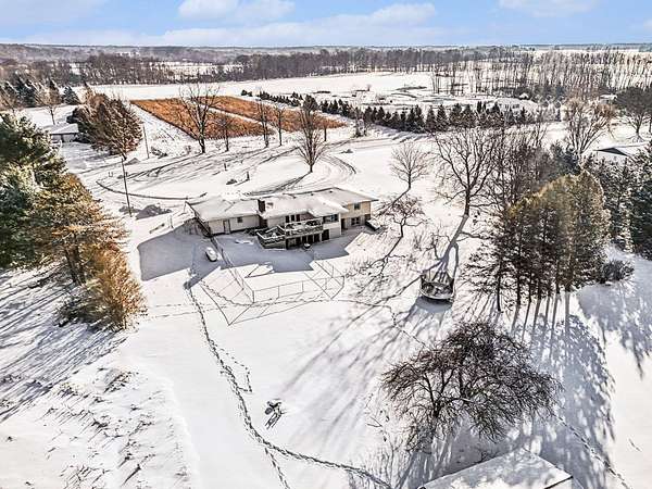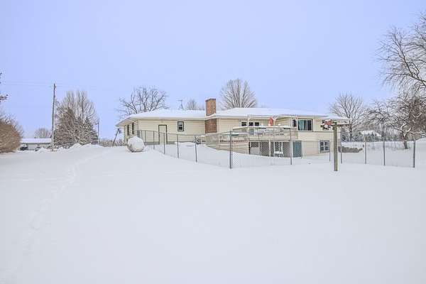Ranch-style home offering 2,305 sq ft of main-level living on over 10 acres, including approximately 7 acres of tillable land. The main floor includes four bedrooms, three full bathrooms, main-level laundry, and a designated dining area. The primary bedroom features an ensuite bathroom. The living room includes a fireplace and direct access to the rear deck. The finished lower level provides additional living space with a kitchenette, bedroom, full bathroom, and family room. Exterior features include a fenced area in the backyard and an expansive deck. The property includes an attached two-car garage plus an additional 24x26 detached garage for storage, equipment, or recreational use. Acreage offers potential for agricultural use, hunting, recreational activities, or leasing the tillable land. A property with multiple use possibilities and privacy, while maintaining convenient access to nearby amenities.