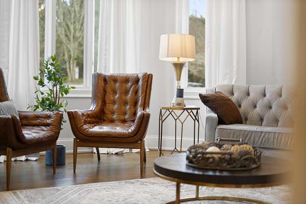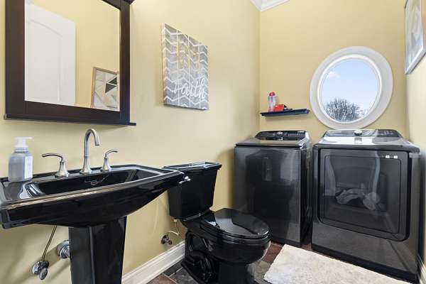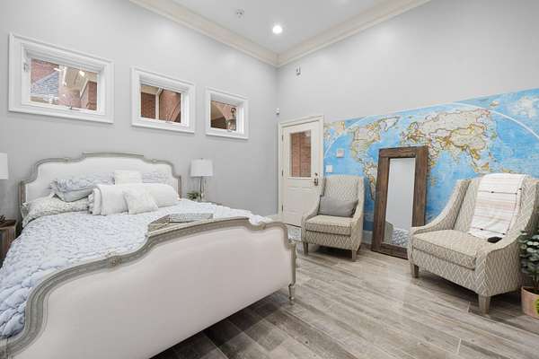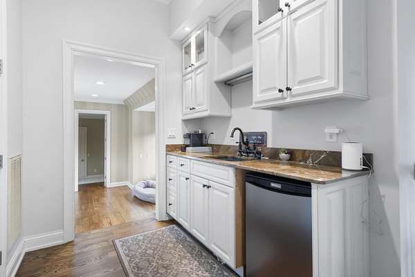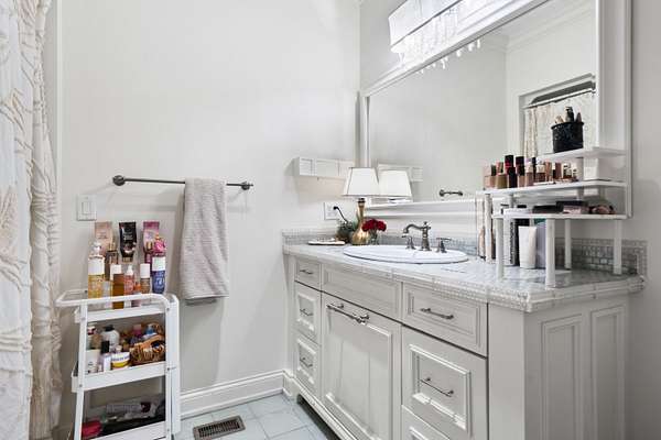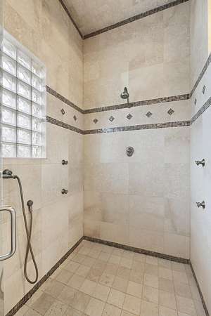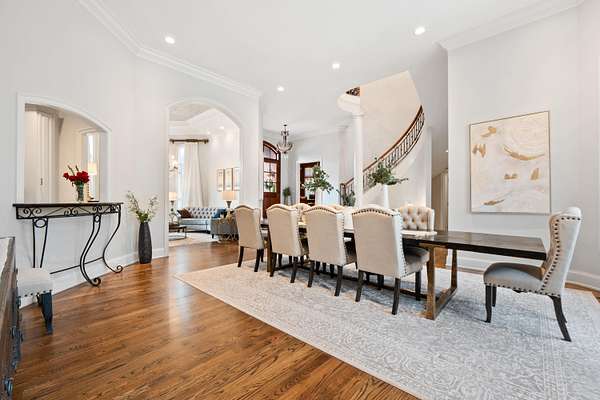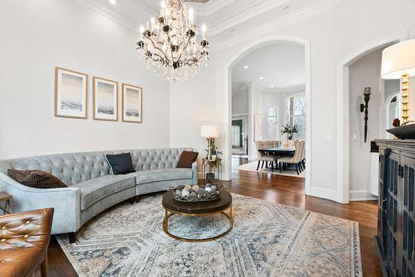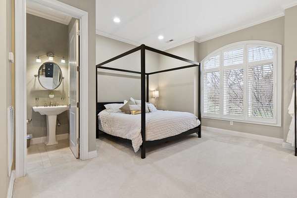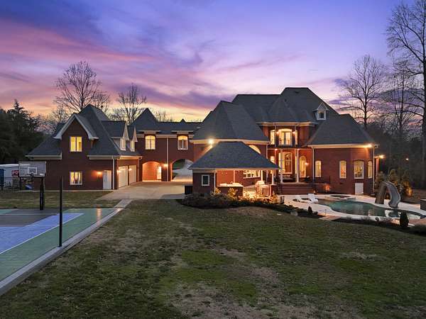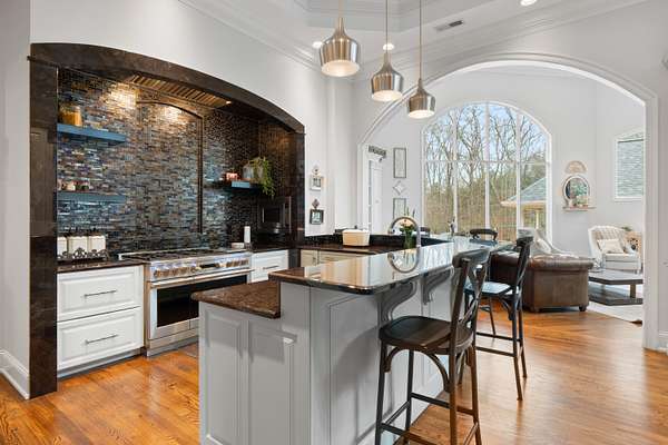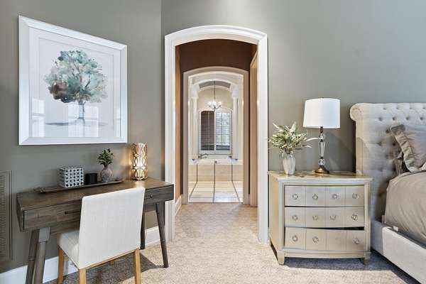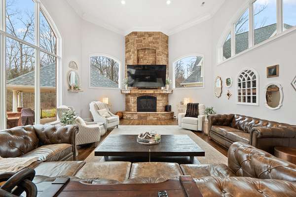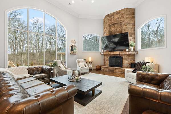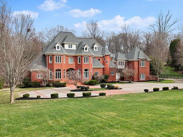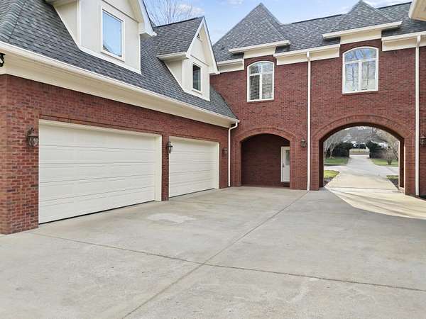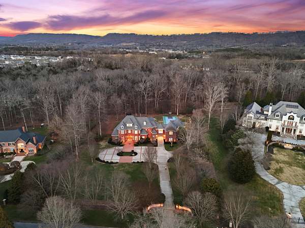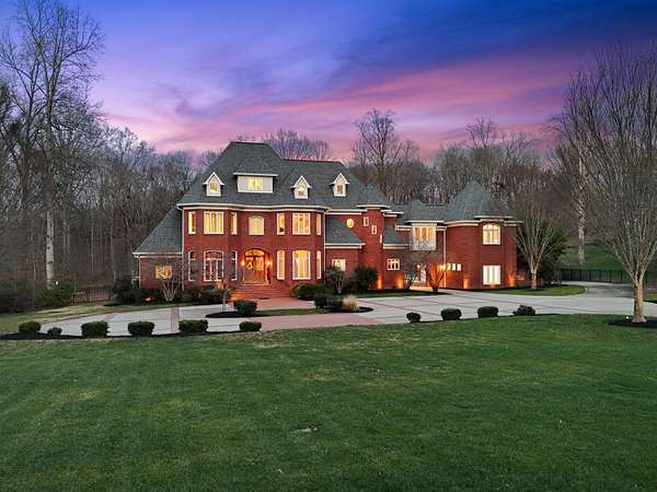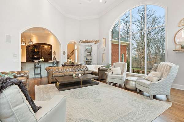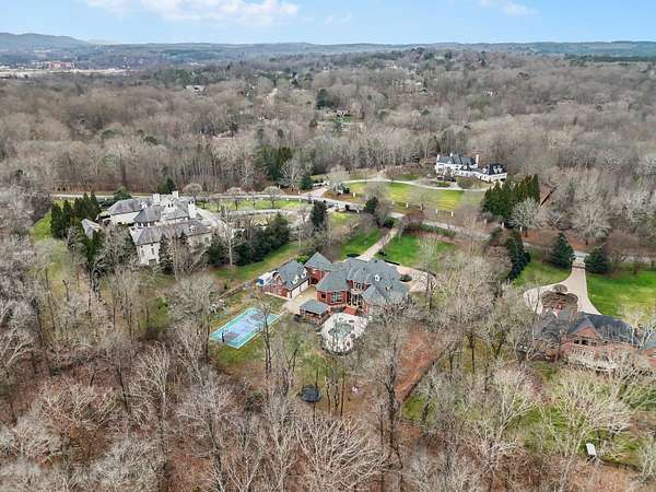 Welcome home to 8831 Forest Creek Ln. A gated estate in a private neighborhood, and only minutes from the interstate, this genuine intersection of luxury, pragmatism and convenience is rarely configured, and even harder to find. Behind the stately brick wall along the road lies a 3 acre property and home that is striking both inside and out. The European inspired facade features multiple gables and a dramatic turret-style tower that adds unique architectural charm. The asymmetry of the attached garage and guest house, connected to the main structure by a breezeway, grounds the executive home and provides a continuation of depth to the structure's position. The red brick exterior nods to the timelessness and durability of such an estate. The well maintained lawn, mature trees, brick inlaid circular driveway, and the grand central entrance with arched brick detailing signal the welcome of a carefully maintained and inviting abode. Just inside the main entrance of the home, a grand foyer awaits. A raised platform and marble tile welcome you into a home of this kind and quality. On the left is the epitome of a study or home office. Inlaid panels, a fireplace, fluted trim, crown molding, coffered ceiling, plantation shutters and wide baseboards are all finished in rich oak. A dancing fire on a rainy day, or the bright sunlight let in by the surrounding windows are sure to create an atmosphere attuned to study, creativity, and musing. After stepping down from the dias, the home opens up to a large dining area, grand staircase on the left and keeping room to the right. In the original plans, these two spaces were swapped, but the sellers have thoughtfully chosen to use these spaces as they currently function - a contained keeping room beautifully arranged with custom seating, ample sunlight, and the custom hand painted inset ceiling - and the large dining area, capacious and sizeable, with plenty of room for entertaining, milling about, and for serving a large gathering. This space continues to the right of the home into the family gathering room. A high, cathedral ceiling, highlighted by the tall stone fireplace and the exquisite picture window that overlooks the backyard at once makes the space feel grand and cozy, if those two words could find meaning in adjacent places. The warmth of the rich wood tones in the gleaming hardwoods that stretch throughout the home, the stone fireplace that anchors the space, and the oversized window and light colored walls and cream accents offer such a juxtaposition. This is a space that feels like it belongs to such an estate, but also feels lived in and well loved. The luxury kitchen is just off of the family room. The custom inset vented range enclave sets the tone for this space. Elevated, unique, and engineered towards simple luxury, this kitchen is perfect for hosting, for daily use, and for entertaining friends that have come over to chat. The custom cabinetry, built by renowned Chattanooga cabinet maker, Mike Norcia and Norcia fine cabinetry, anchor these luxury spaces and serve as the backdrop for the real magic that happens in a space like this: when people gather. The Subzero fridge in its own custom surround, Cove dishwasher, Viking microwave, and 48" six burner Monagram Range continue to tell the story of this home: understated luxury that functions as easily as it shows. Additionally, these appliances are less than 2 years old. A mud area, large laundry room, half bath, a wet bar with more storage and its own separate dishwasher, and back staircase all make up the remaining right side of the home. These spaces are also well appointed visually and complete each need that could be imagined in a home like this. On the left side of the main floor, you'll find the primary suite. The bedroom features incredible coffered ceilings, another gas fireplace, a convenient walkout covered patio area, and plenty of space for a sitting area. The large primary bathroom is the showpiece of this space.