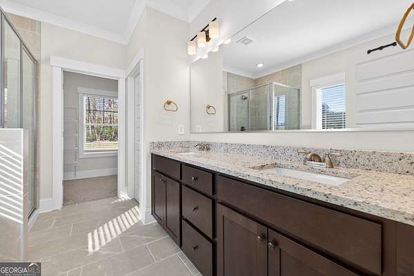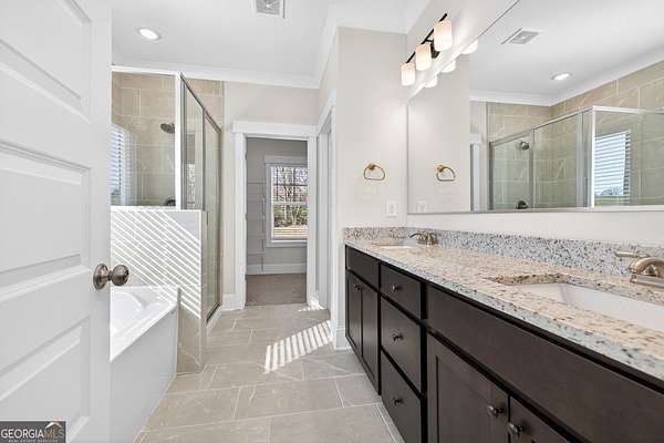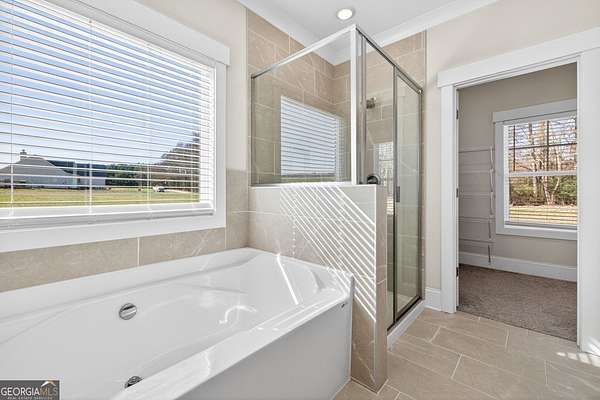 - Double Vanity, Master On Main Level, Separate Shower, Soaking Tub, Split Bedroom Plan, Tile Bath, Walk-In Closet(s)
