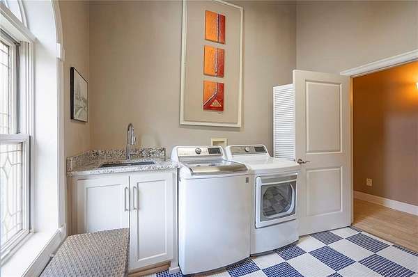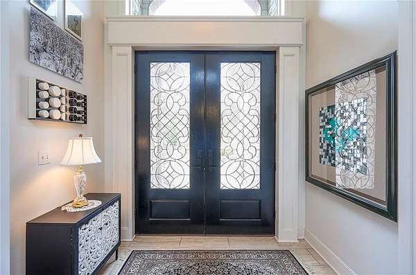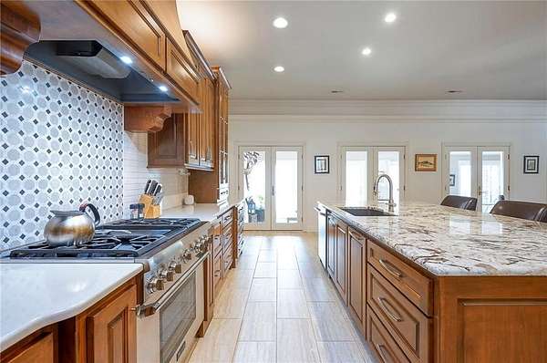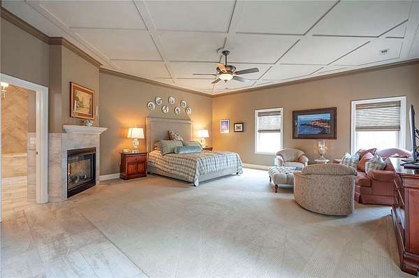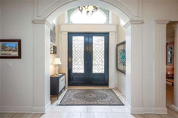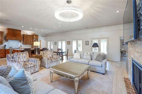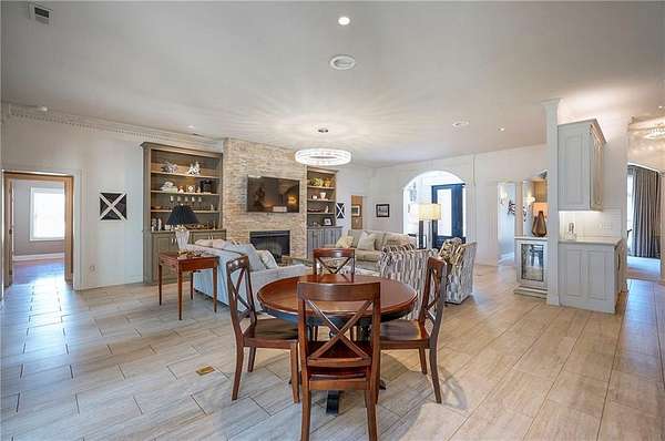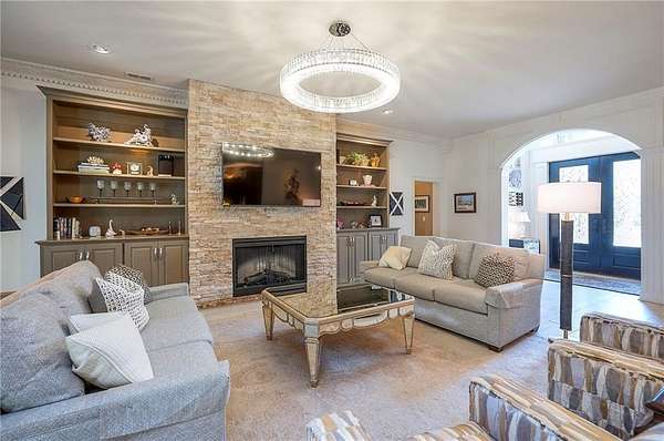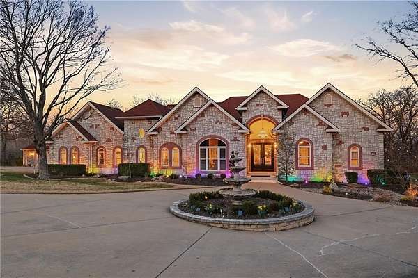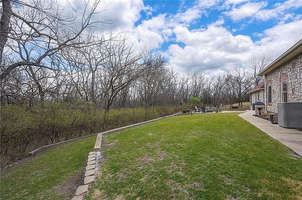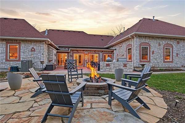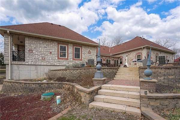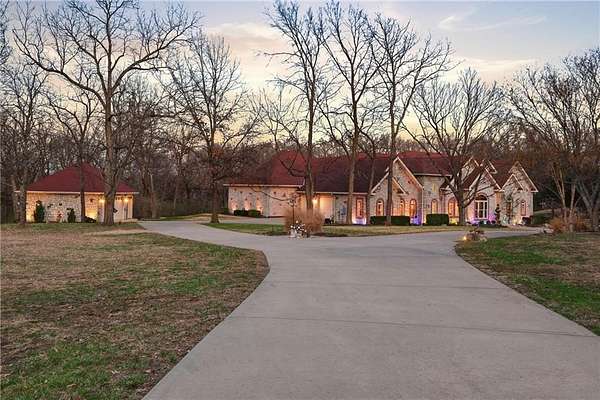 Rare opportunity to own a 5,350 sq ft ranch estate on 9+ private acres backing to the 231-acre Black Hoof Park in Lenexa. Enjoy direct access to trails, nature, and a nearby lake while still being minutes from city amenities. Head past the gated entrance to the circle driveway with a gorgeous fountain to the custom leaded glass front door. Once you are inside- you will find the perfect entertaining space. The remodeled chef's kitchen features custom stained cabinetry, stone countertops, marble mosaic backsplash, and premium appliances including a Thermador gas range with four burners and griddle. The kitchen opens to a spacious living room with stacked stone fireplace, built-ins, crystal chandelier, and multiple sliding doors leading to a sunroom overlooking the trees. Designed for entertaining, the outdoor living space includes a brick patio with outdoor fireplace and grilling area plus a custom stone patio with fire pit surrounded by mature landscaping and abundant wildlife. Additional living space includes a family room with wet bar, fireplace, and large windows, plus a covered balcony- a perfect spot for relaxing. Many areas of the home feature heated tile floors, crown molding, and neutral decor. The primary suite offers a private retreat with fireplace, custom ceiling trim, and a spa-like bath featuring a jetted tub with herringbone tile surround, oversized walk-in shower, double vanity, chandelier lighting, and an enormous walk-in closet with center island. Additional highlights include large secondary bedrooms with ceiling fans, main-floor office with private bath, oversized laundry room, three-car garage, walkout basement garage, detached two-car garage with wood stove, and a secure gated driveway. Constructed with steel framing supporting full stone siding, triple-pane leaded glass windows, five gables, and a custom leaded glass front door, this extraordinary property offers luxury acreage living with unmatched privacy and park access. Call today.