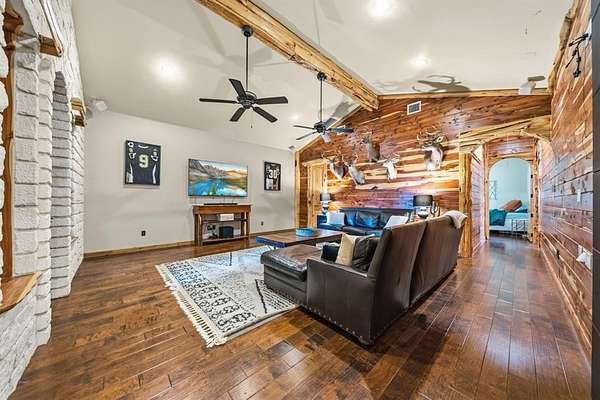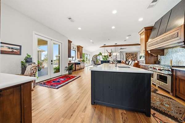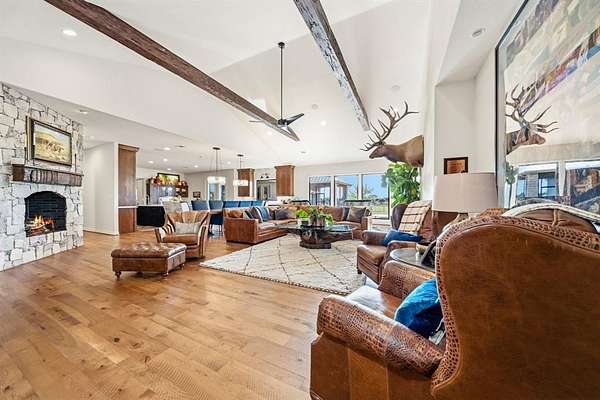 This fully remodeled 6,514 square foot estate offers an unmatched combination of luxury living, privacy, and expansive acreage. The main residence features 6 bedrooms, 4 full baths, and 2 half baths. The home features all wood floors throughout, 3 fireplaces, 2 gas and 1 wood burning, and a storm safe room. A dry sauna and steam room shower add resort-style amenities rarely found in a private residence. A whole house generator and security system were added in 2025. The property includes an oversized 2 car-attached garage and is served by co-op water and 2 private water wells, and whole-property water filtration serving the house, yard, and garden.