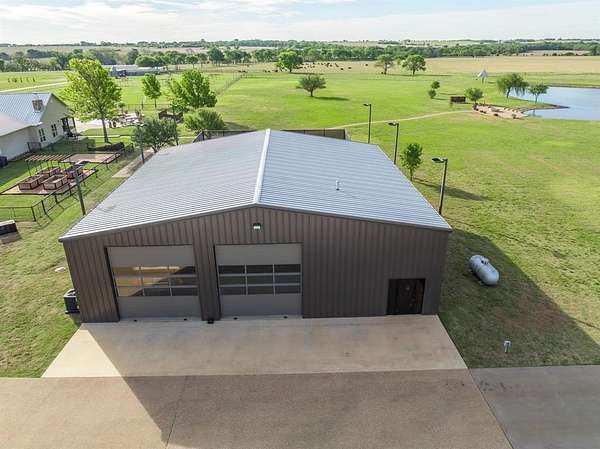 Additional structures include a detached 1,600 sq ft 4-car oversized garage with full HVAC, a workout room, and office space. A 3,600 sq ft shop built in 2023 features 20-foot walls, full foam insulation, 3-12x14 electric doors, pine-finished walls, LED lighting, full HVAC, 50-amp RV plug, and a private septic. The property also includes a 5,500 sq ft livestock show barn with five stalls, an office, and half bath.
