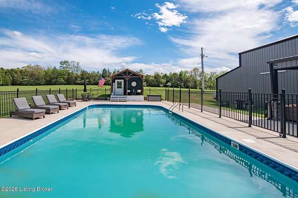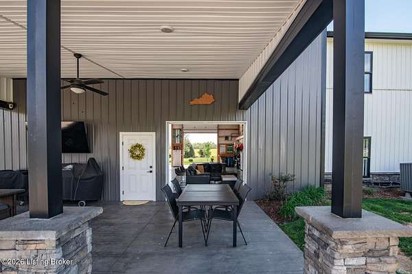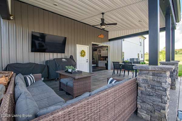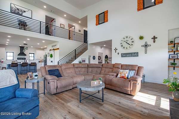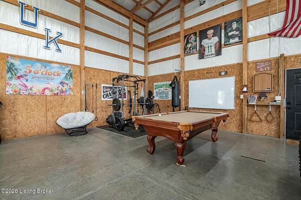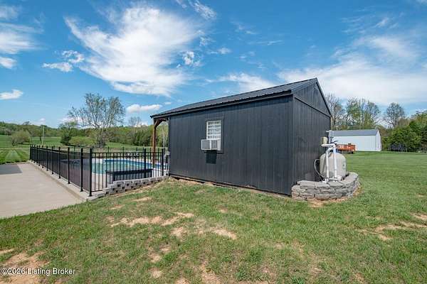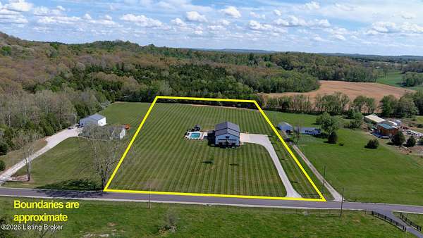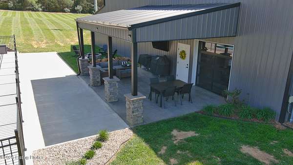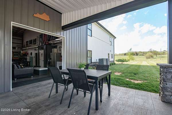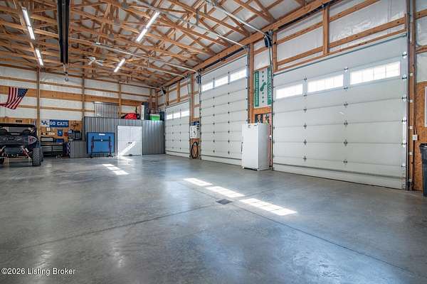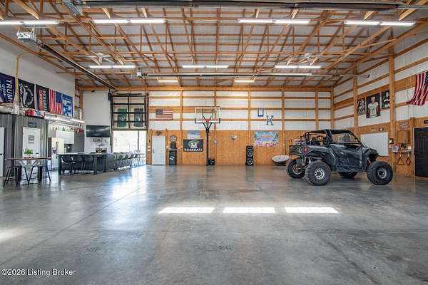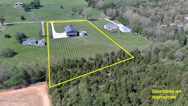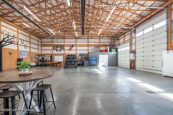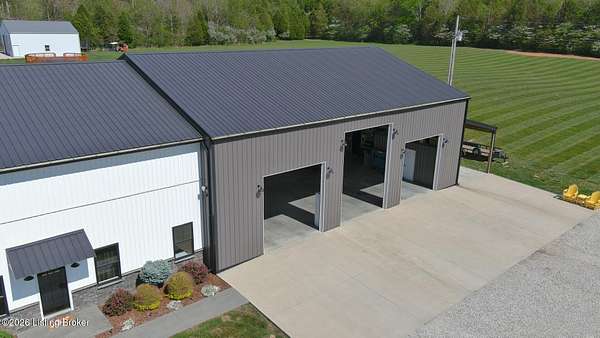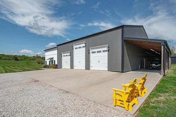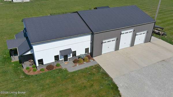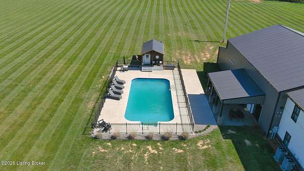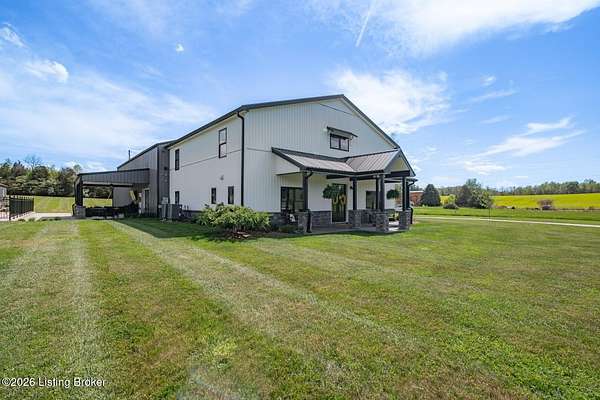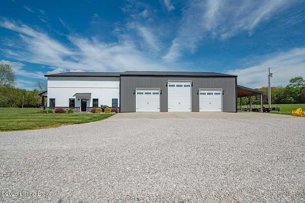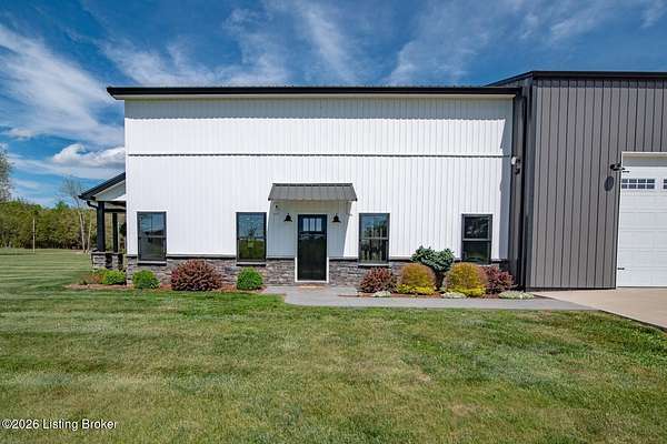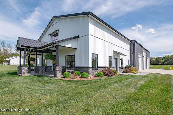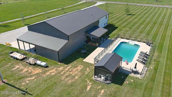 WELCOME TO 888 MILAN RD., Payneville, KY. This Beautiful custom designed Barndominium-style home features 3 bedrooms and 4 baths, 2 kitchens, a 50' x 60' Shop/Garage complete with 2: 12' x 12' Garage Doors, and 1: 16' x 12' Center Door with Commercial & wall mount openers. A 10' x 10' glass Garage door leads out to covered patio & breathtaking pool area . The main kitchen is a standout with quartz countertops, custom cabinetry, large island, pantry, & Gas range/oven, opening to a warm, inviting living space with a Gas Log fireplace. The Primary Suite offers a relaxing retreat with a beautiful en-suite bath and Large walk in closet. A spacious , well-organized Main level Laundry Room adds to this home's everyday functionality & convenience. Upper level features a Large Bonus/Family room, 2 bedrooms with walk in closets, and a full bathroom with double vanity. The TRUE highlight of this property is the separate entertainment living area, complete with a 2nd kitchen & 4th Bathroom, offering flexible space for guests, and large gatherings. This area opens directly onto a large covered patio, leading to a stunning custom designed in=ground pool with expansive concrete decking & pool house-creating a private outdoor oasis. All situated on mostly open, beautifully maintained acreage with added privacy, this property offers the perfect combination of country living, modern amenities, & exceptional entertaining space. Schedule your showing today!