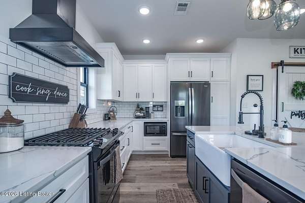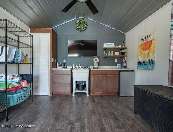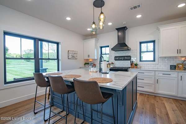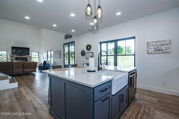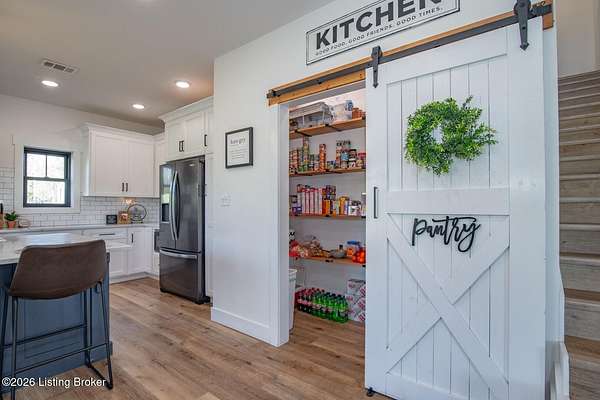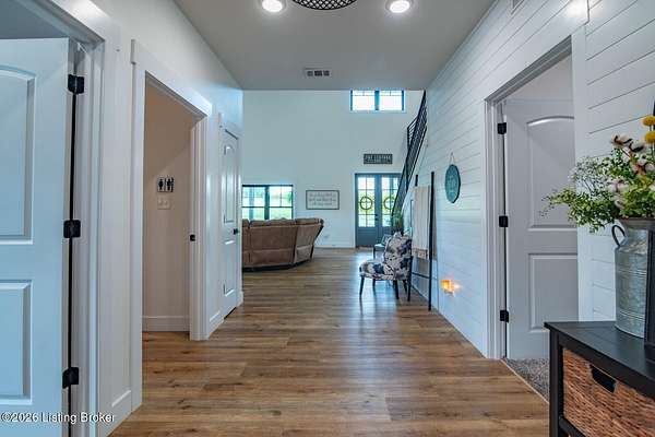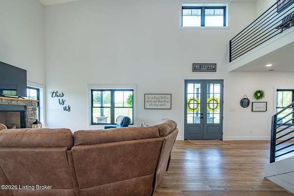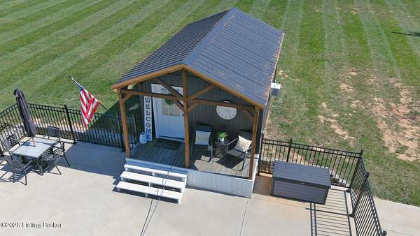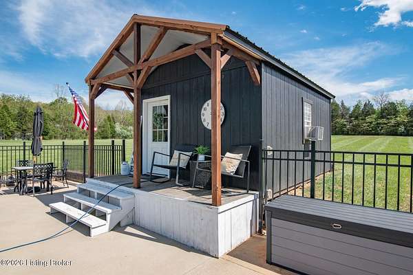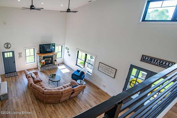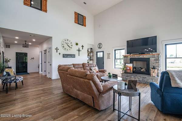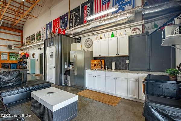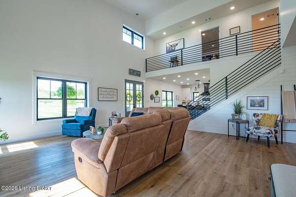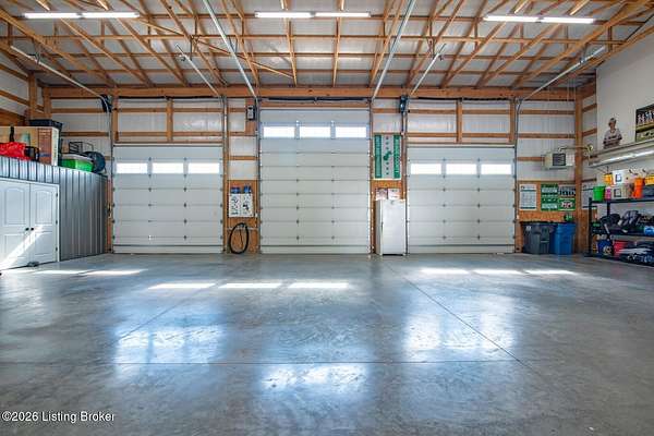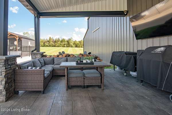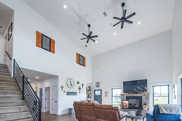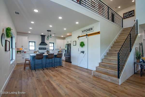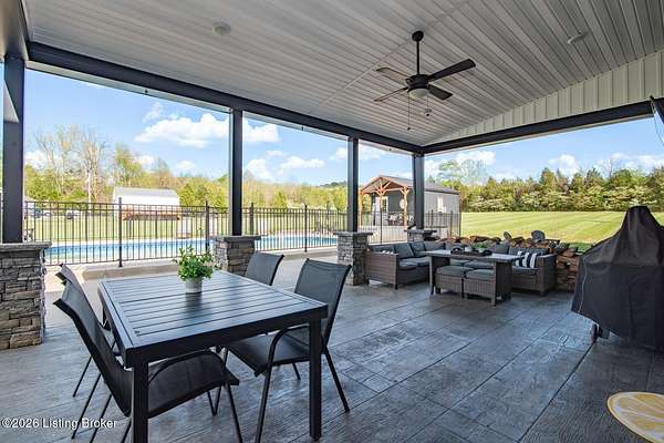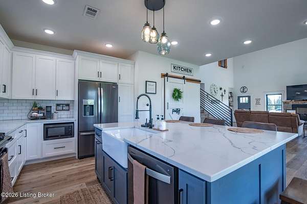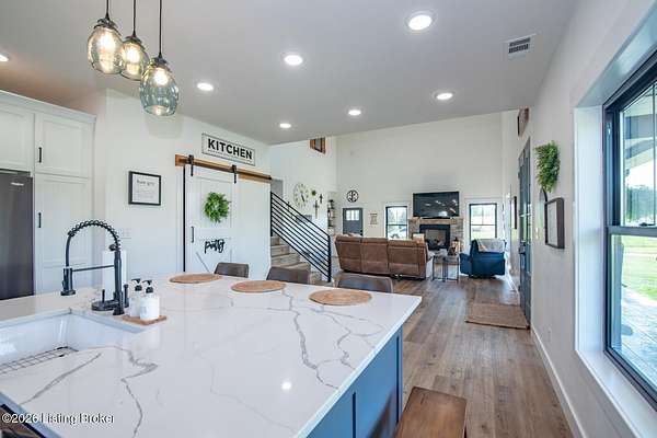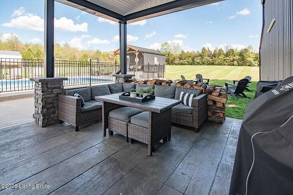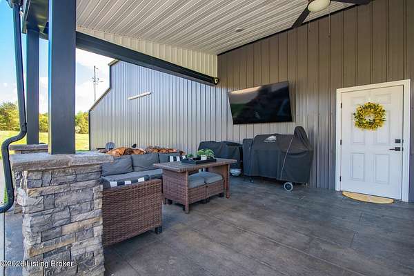 WELCOME TO 888 MILAN RD., Payneville, KY. This Beautiful custom designed Barndominium-style home features 3 bedrooms and 4 baths, 2 kitchens, a 50' x 60' Shop/Garage complete with 2: 12' x 12' Garage Doors, and 1: 16' x 12' Center Door with Commercial & wall mount openers. A 10' x 10' glass Garage door leads out to covered patio & breathtaking pool area . The main kitchen is a standout with quartz countertops, custom cabinetry, large island, pantry, & Gas range/oven, opening to a warm, inviting living space with a Gas Log fireplace. The Primary Suite offers a relaxing retreat with a beautiful en-suite bath and Large walk in closet. A spacious , well-organized Main level Laundry Room adds to this home's everyday functionality & convenience. Upper level features a Large Bonus/Family room, 2 bedrooms with walk in closets, and a full bathroom with double vanity. The TRUE highlight of this property is the separate entertainment living area, complete with a 2nd kitchen & 4th Bathroom, offering flexible space for guests, and large gatherings. This area opens directly onto a large covered patio, leading to a stunning custom designed in=ground pool with expansive concrete decking & pool house-creating a private outdoor oasis. All situated on mostly open, beautifully maintained acreage with added privacy, this property offers the perfect combination of country living, modern amenities, & exceptional entertaining space. Schedule your showing today!