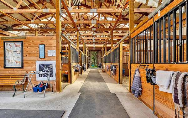 Barn has Dual concrete center aisles, heated tack room, padded stalls & overhead stall fans.
