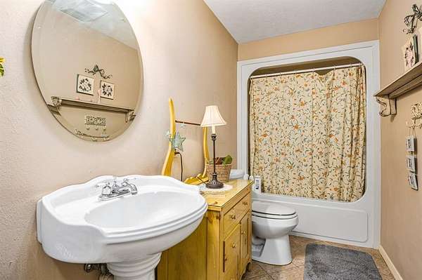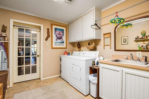 The floor plan provides privacy with a secluded primary suite featuring a double vanity, walk-in closet, separate shower, and garden tub. The secondary bedrooms are well-sized, and the laundry room includes a convenient sink. Outdoor amenities include a large covered back porch, a 2-car carport, a dedicated RV carport, a workshop with electricity, and an additional metal building.