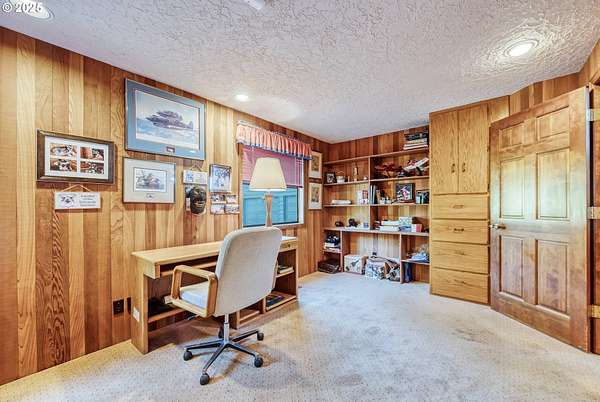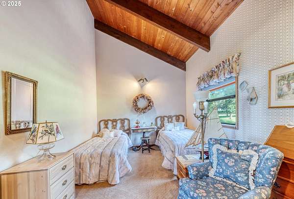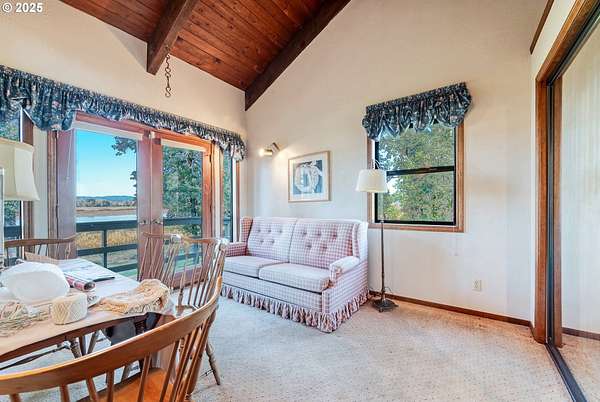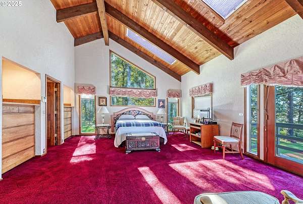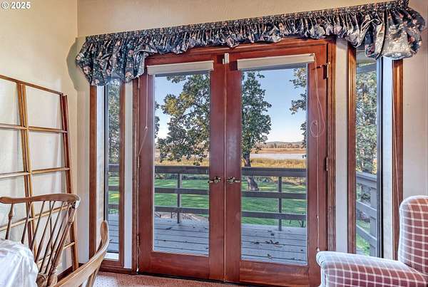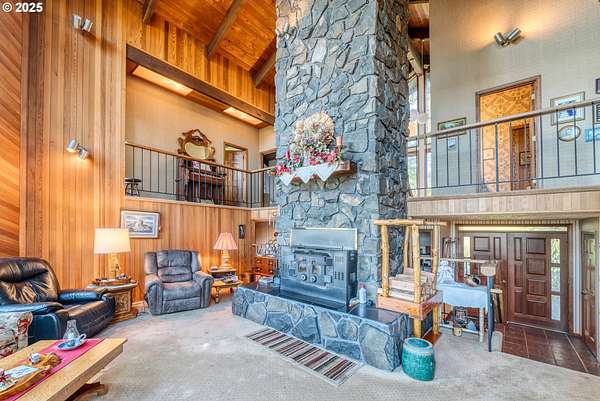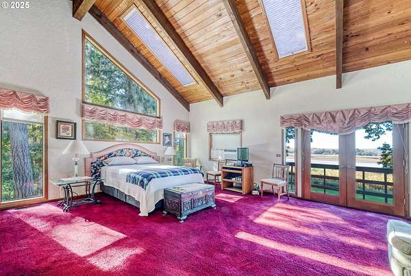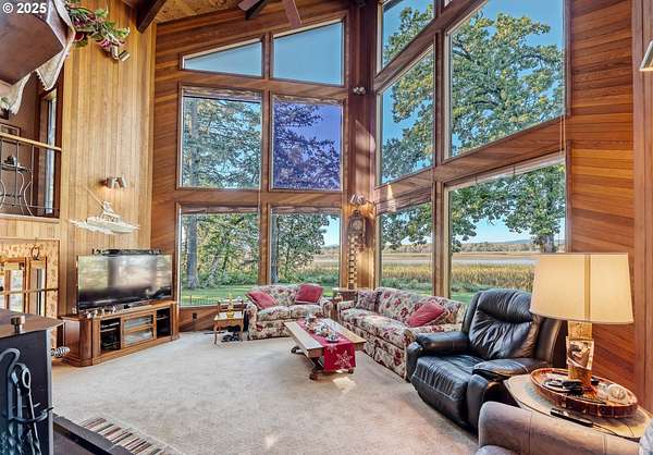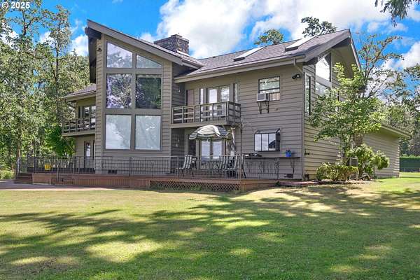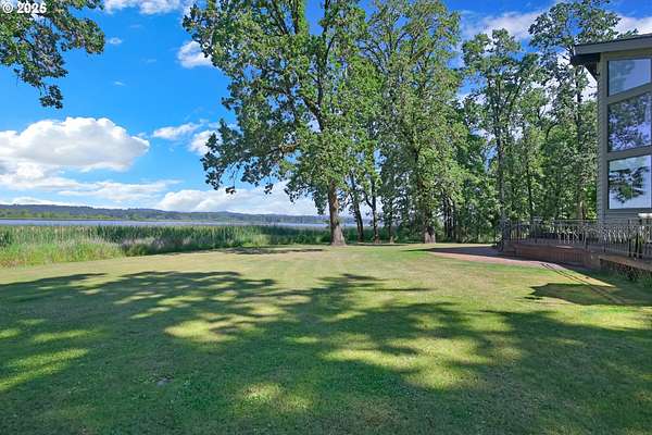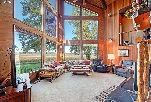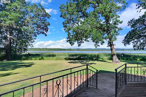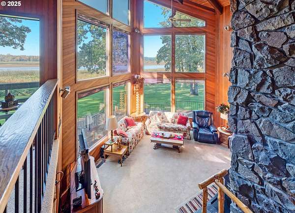 Private lake front living in Oregon! A beautiful custom lodge-style home and huge woodshop/barn on 7.4 acres of fully fenced, park-like setting on Fern Ridge Reservoir. This 4 bedroom/3 bath home has floor to ceiling windows bringing the fabulous outdoors into your living space! With amazing views of Fern Ridge Lake and the Long Tom River for year-round splendor! Unprecedented wildlife viewing: migratory birds, deer and bald eagle sightings daily! Unprecedented wildlife viewing: migratory birds, deet and bald eagle sightings daily! A paved private drive with gated entrance, garden, and two greenhouses welcome you to the property. The two-story home with a brand-new roof has a detached RV/3 car garage with breeze-way access to the main house. An inviting step-up living room with a dramatic two-story stone fireplace makes for a cozy ambiance. A cedar deck wraps around the home offering entertaining space for watching sunset on the lake. Vaulted ceilings, cedar paneling, and balconies off of the primary bedroom and guest room. The primary bath has a sauna and much more! There is a 4th bedroom on the main level of the home. The kitchen is light and bright with French doors off to yet another outdoor deck for easy entertaining. The woodshop is part of a barn structure and has an office as well. The property is irrigated with two wells; one at 30 gpm and the other at 60 gpm. Everything you need to make this your rear-round or ultimate vacation home.