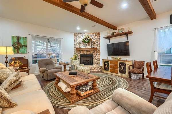 STOP the scroll--this unicorn property is real and it's DREAMY! 18.9 acres of pure Texas heaven with a wildlife exemption, two giant ponds, and porches that practically beg you to sit and sip something sweet and watch all the wildlife in natural habitats. The main house(Over 3000 sq ft) is a 4 bed, 3.5 bath showstopper with upgrades galore: a pot filler (who wants to move pots?!), a pan warmer, large laundry room with pet food storage, and a garage so big it has a loft--yes, a LOFT!