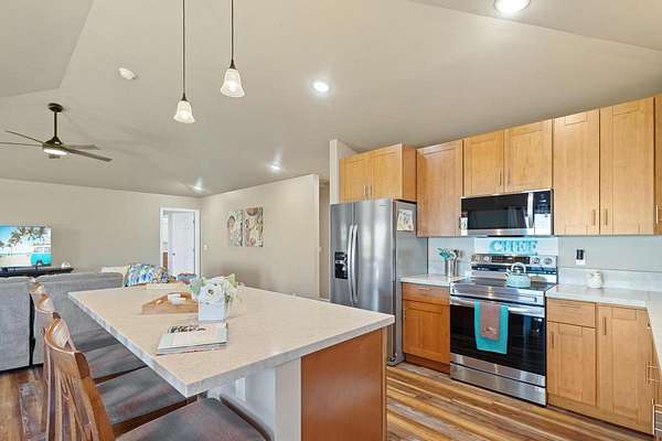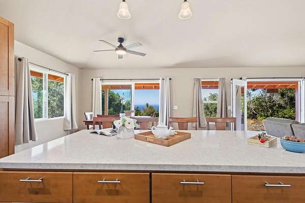 2025 NEW, PRISTINE HOME, MACNUT FARM, OCEAN VIEWS ON PRIVATE 8.64 ACRES Property is gated & fully fenced. Approximately 360 producing Macnut Trees. Macnut grove plus 9 avocado trees, orange and mango trees. New 10,000 gal. water tank w/UV filtration system. Home is furnished move in ready. Open and airy living area leads out to a large lanai for your outdoor living and al fresco dining. Living and dining area features vaulted ceilings, pendant lights over the spacious kitchen island with cabinets and bar seating. Quartz counter tops with backsplash, bamboo style soft close cabinets ceiling height plus a pantry. New stainless-steel appliances. Living room is complete with French doors and upgraded sliders and windows for natural light and views. Huge ensuite with ocean views, large walk-in closet w/shelves. Slider that opens onto the lanai. Ensuite bath with a skylight, dual sinks, quartz counter, bamboo soft close cabinets, linen closet and a walk-in shower. Private guest bedroom and a full guest bath with quartz counter, bamboo soft close cabinet and a tub/shower. Laundry room with a skylight, shelves, storage closet, new Samsung Washer & Dryer plus a laundry sink. Hybrid AO Smith 50 gal. water heater. Other features include luxury vinyl flooring throughout new ceiling fans recessed lighting Clean and pristine move in ready. Private lot with easy access to the Hwy. Live and work your own Macnut farm with income. Potential for much more planting, raised gardens, etc. Nearby beach, restaurants, Sat open market, post office, markets, gas stations. A short drive to Kahuku National Park.