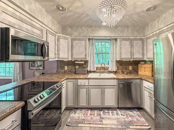 Est $1,861/mo3 bedroom, 2 full bath beautifully done home sitting in the middle of 1.57 acres of lush woodland, bordered by a beautiful, bubbling, rocky bottomed creek. Two sided wrap-around porch that is an extension of the home and feels like sitting in a treehouse leads you into the main floor and offers a spacious living room, dining room, kitchen, full bath, laundry and main bedroom. Downstairs features two guest bedrooms, full bath and family room plus another patio. End of the road, total privacy, unrestricted land, beautiful creek and private well - yes please. Located just north of Blueridge, GA and west of Murphy, NC