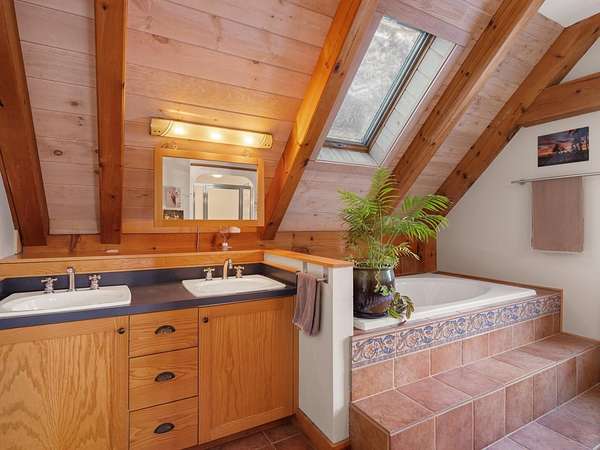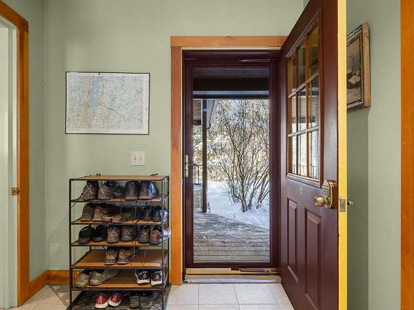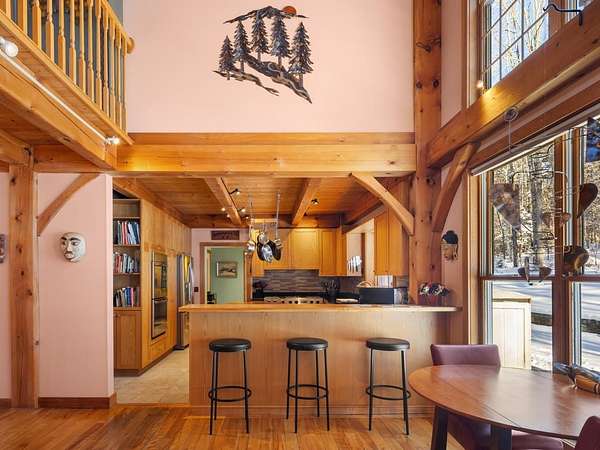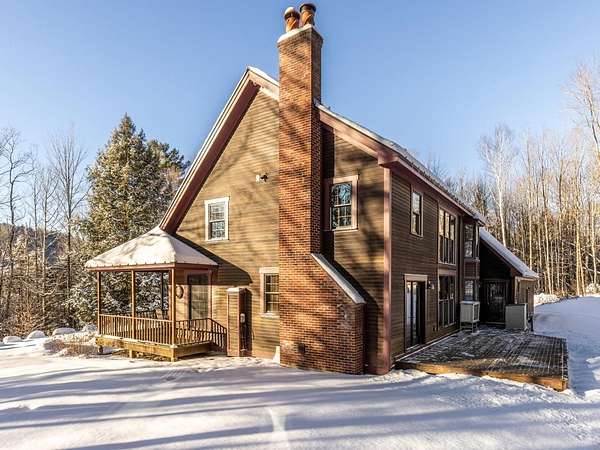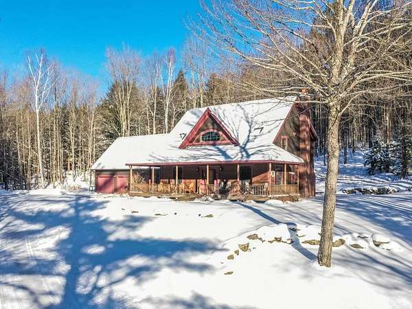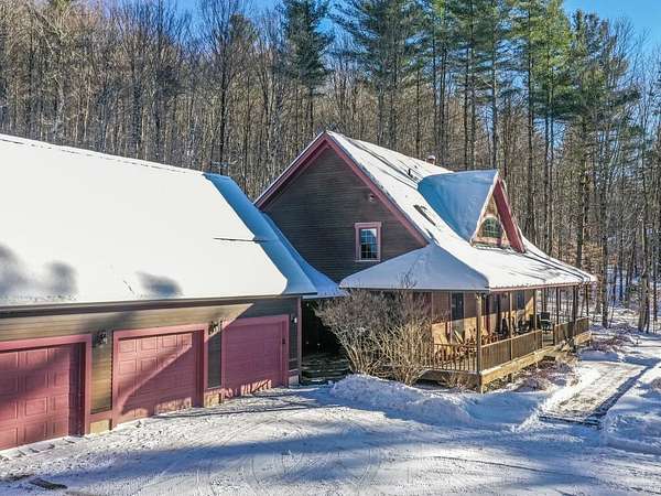 Located at the end of a private road, this charming Cape-style home sits nestled in the woods. A covered front porch welcomes you to a spacious mudroom with laundry and half bath. Cathedral ceilings soar above the open living space, and a wall of windows floods the interior with natural light, highlighting the stunning timber-frame craftsmanship. The chef's kitchen features a butcher-block island, high-end appliances, and granite countertops. Enjoy both casual and formal dining areas, a living room with wood-burning fireplace, and a cozy den/office tucked behind pocket doors. Upstairs, a large landing overlooks the first floor, showcasing the beautiful beam details, and leads to a primary suite with a walk-in closet and soaking tub, two guest bedrooms, and a shared bath. The front porch offers seasonal mountain views, and the back deck is perfect for dining al fresco in the warmer months. Six-zone radiant heat, a Buderus furnace, and Generac generator ensure comfortable country living. The attached 3-car garage provides ample storage, with a walk-up attic and convenient basement entry. This 1.83-acre wooded lot includes perennial gardens and lawn space, plus 35 acres of tax-abated common land shared with just four neighbors. Embrace the joy of small-town living just 30 minutes from Burlington. Easy access to recreation with the VAST trail, Camel's Hump State Park, and Sleepy Hollow minutes away, and just a short drive to the slopes at Mad River Glen & Sugarbush ski resorts.
