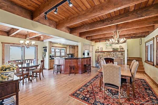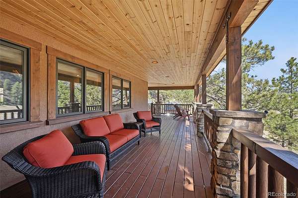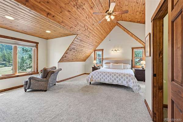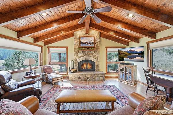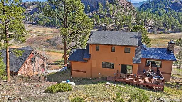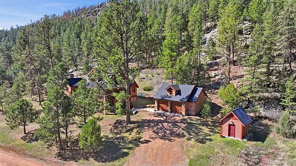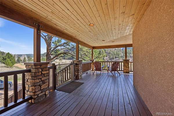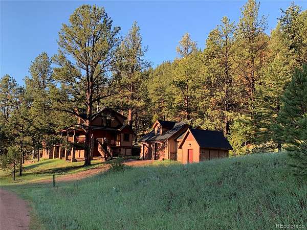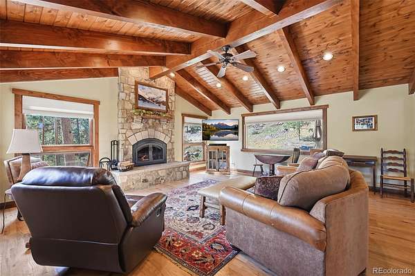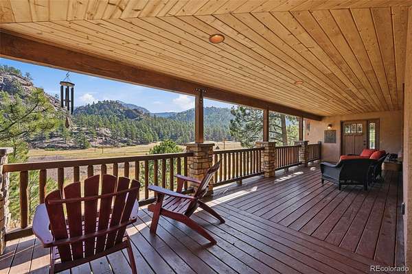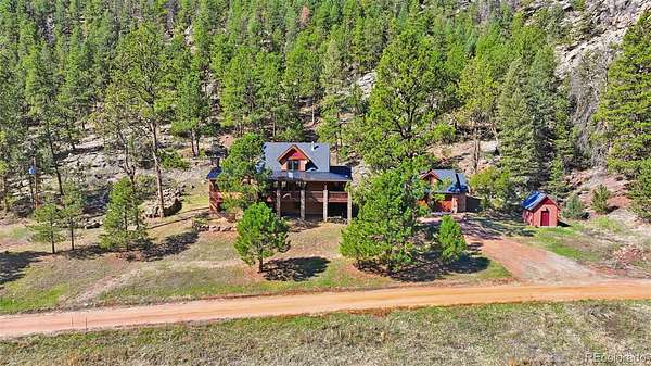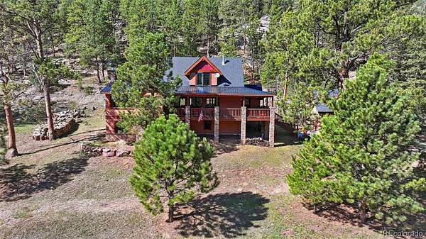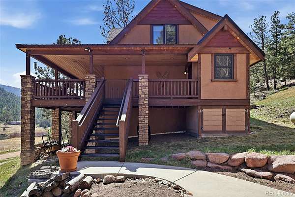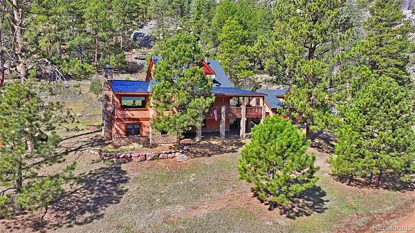 This extraordinary property offers 10.70 acres of pristine Colorado wilderness, where peaceful meadows, towering pines, striking rock outcroppings, & sweeping mountain vistas create a truly unforgettable setting. The home’s inviting wraparound covered porch sets the tone for the warmth & elegance found within. Step inside to a breathtaking interior where natural light pours through picturesque windows, illuminating the formal living room. Anchored by cozy hardwood floors & dramatic cathedral ceilings, this space is both grand & inviting, centered around a stunning stone fireplace that creates the perfect gathering place year-round. The open-concept dining area & kitchen are designed with entertaining in mind, offering seamless flow & generous seating around the central island. The kitchen is a chef’s delight, featuring upgraded appliances, abundant cabinetry, & expansive countertops, all thoughtfully designed to blend beauty with everyday functionality. Upstairs, the expansive primary retreat provides a private sanctuary. Soaring cathedral ceilings continue here, enhancing the spacious feel, while a charming seating nook invites quiet moments of relaxation. The suite includes a private¾ bath, dual walk-in closets, & a versatile bonus space ideal for a home office, personal library, hobby room, or dressing area. The newly refinished basement expands the home’s living possibilities with a large family room perfect for hosting guests, along with a garden-level bedroom complete with a cozy reading nook. This level also features a ¾ bathroom, a dedicated laundry/utility room, & 2 generous storage areas. Perfectly positioned adjacent to BLM land, this property offers unmatched access to outdoor adventure. Just across the road, a private stream stocked with rainbow & brook trout, adds to the serene, nature-rich lifestyle. This is more than a home; it’s a rare opportunity to live immersed in Colorado’s natural beauty without sacrificing comfort or elegance.