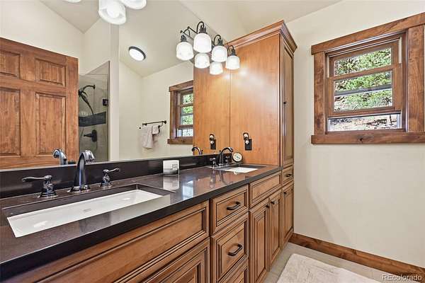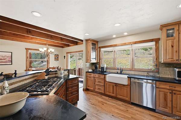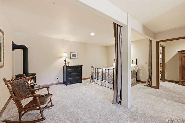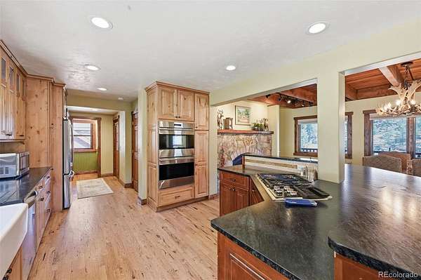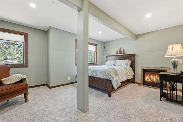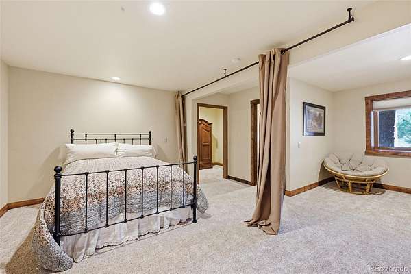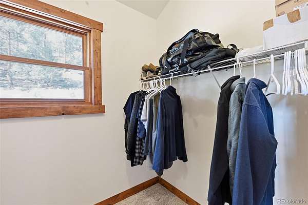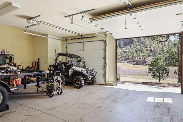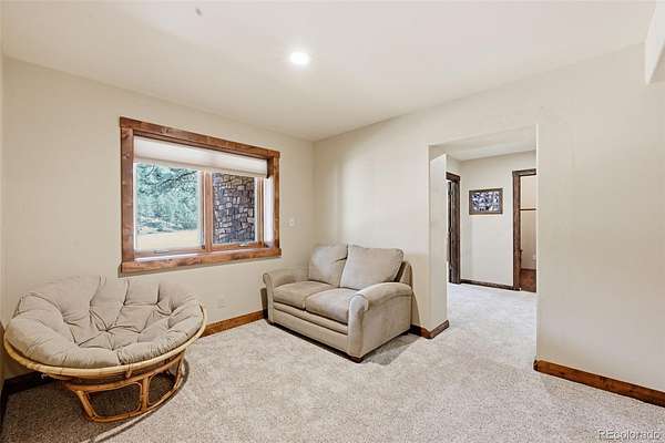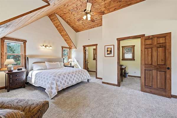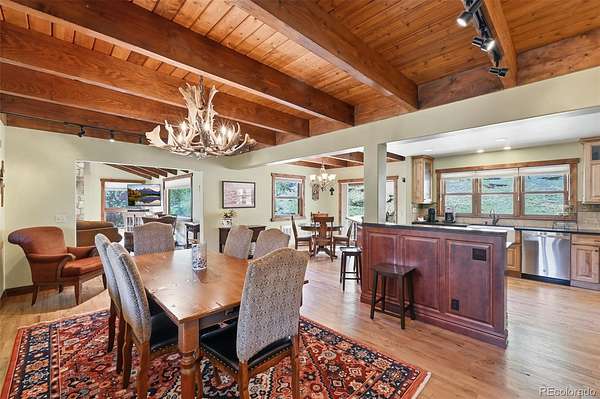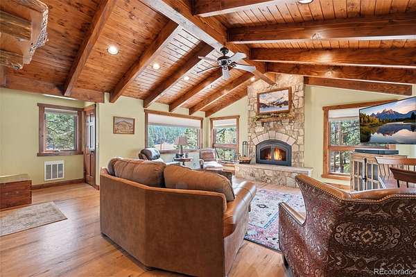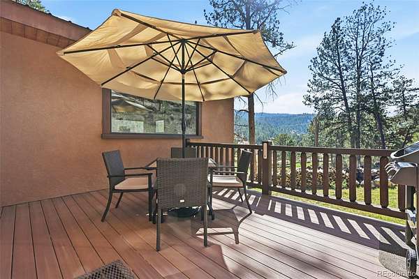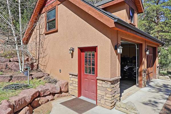 This extraordinary property offers 10.70 acres of pristine Colorado wilderness, where peaceful meadows, towering pines, striking rock outcroppings, & sweeping mountain vistas create a truly unforgettable setting. The home’s inviting wraparound covered porch sets the tone for the warmth & elegance found within. Step inside to a breathtaking interior where natural light pours through picturesque windows, illuminating the formal living room. Anchored by cozy hardwood floors & dramatic cathedral ceilings, this space is both grand & inviting, centered around a stunning stone fireplace that creates the perfect gathering place year-round. The open-concept dining area & kitchen are designed with entertaining in mind, offering seamless flow & generous seating around the central island. The kitchen is a chef’s delight, featuring upgraded appliances, abundant cabinetry, & expansive countertops, all thoughtfully designed to blend beauty with everyday functionality. Upstairs, the expansive primary retreat provides a private sanctuary. Soaring cathedral ceilings continue here, enhancing the spacious feel, while a charming seating nook invites quiet moments of relaxation. The suite includes a private¾ bath, dual walk-in closets, & a versatile bonus space ideal for a home office, personal library, hobby room, or dressing area. The newly refinished basement expands the home’s living possibilities with a large family room perfect for hosting guests, along with a garden-level bedroom complete with a cozy reading nook. This level also features a ¾ bathroom, a dedicated laundry/utility room, & 2 generous storage areas. Perfectly positioned adjacent to BLM land, this property offers unmatched access to outdoor adventure. Just across the road, a private stream stocked with rainbow & brook trout, adds to the serene, nature-rich lifestyle. This is more than a home; it’s a rare opportunity to live immersed in Colorado’s natural beauty without sacrificing comfort or elegance.