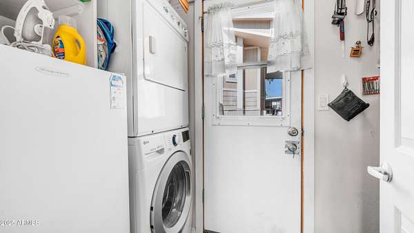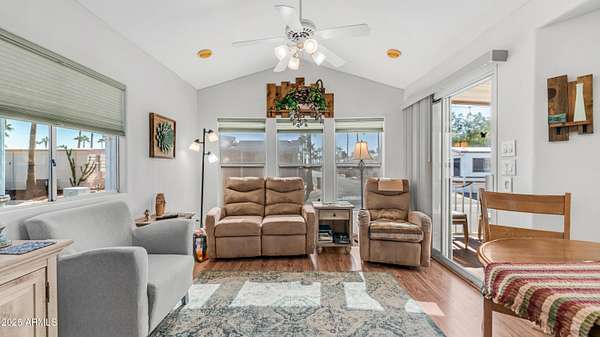 Amazing location just steps from the popular pet area with wonderful pet section views, perfect for taking in the lively atmosphere & nearby Reflection Park. Step inside this bright & welcoming home where thoughtful updates & cozy touches make it truly special. The main home has been finished off with ideal tape & textured wall finishes that give it a polished feel. The kitchen offers beautiful updated countertops, a refrigerator, & plenty of cabinet space for all your cooking needs. The open living area features vaulted ceilings, warm wood look laminate flooring, & inviting decor that makes it easy to relax or entertain. The bedroom provides exceptional storage with a built in dresser & a full wall of mirrored closets, while the bathroom includes a convenient walk in shower. Continue into the spacious Arizona room, ideal for guests or a quiet retreat, with solid surface flooring, a second half bath, a bonus freezer, & a stacked washer & dryer for added convenience. Outside, you'll find under deck storage plus more storage cabinets behind the home for all your extras. Fully furnished & ready to enjoy, this home is just a short stroll to the clubhouse where you can dive into all the amazing Golden Vista amenities including two sparkling pools, a billiards room, card games, horse races, dinner shows, dances, & so much more. This is truly the perfect blend of comfort, convenience, & community living.