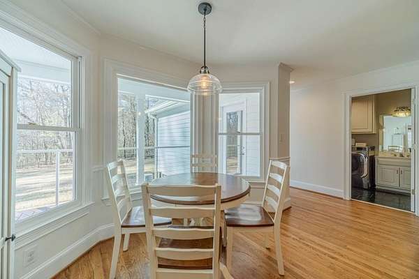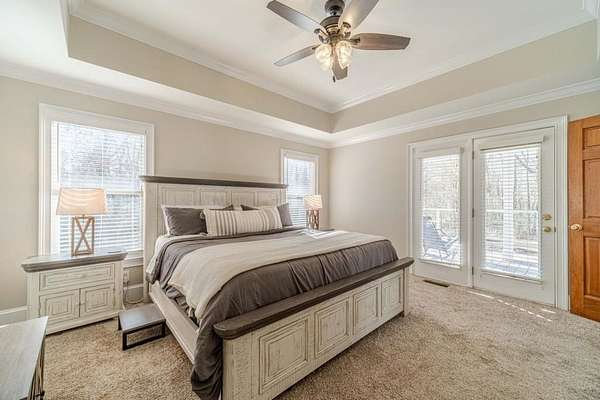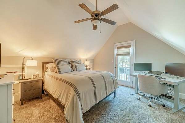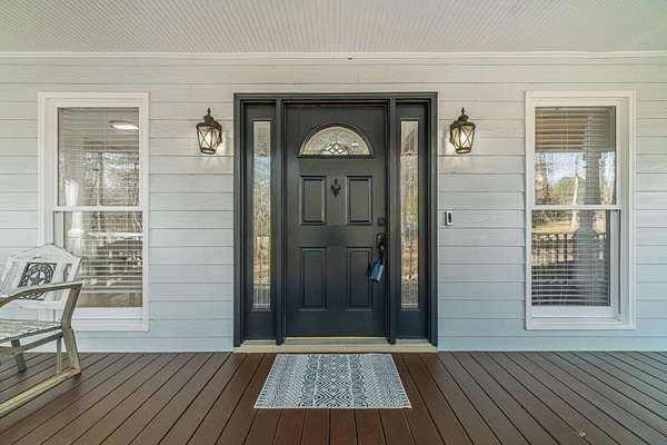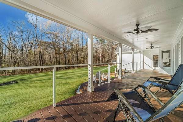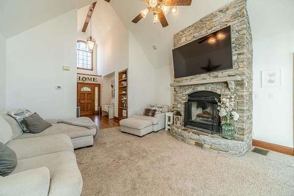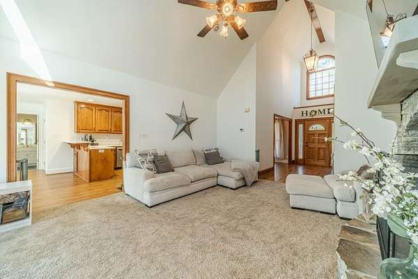Have you been searching for a ranch home on acreage with no HOA? This is it. Situated on 4.8 gated acres of beautiful private property, this home offers space, versatility, and charm. The home features a two-car side-entry garage, plus a separate detached two-car garage with an office. Behind the detached garage is a fenced dog run and two chicken coops-perfect for chickens, goats, or other animals. Enjoy the large rocking-chair front porch and a covered rear deck with a new wide staircase leading to a level backyard. Mature trees provide wonderful privacy throughout the property. The main level offers three bedrooms and two full baths, both of which have been updated with tasteful, modern finishes. The oversized dining room easily accommodates a table for ten to twelve. The great room features a stacked-stone masonry fireplace with a propane starter and soaring vaulted ceilings. The kitchen includes abundant solid wood cabinetry, solid surface countertops, and a breakfast room with a bay window overlooking the backyard. The primary suite offers a large walk-in closet, double tray ceiling, and direct access to the rear deck. Built-in bookshelves are found in four rooms throughout the home. The main-level laundry room includes a sink and space to add an additional toilet. Upstairs is a bonus room with its own full bath, large walk-in closet, attic access, and a charming Romeo and Juliet balcony. Additional features include low utility costs with septic and well water, many Champion energy-efficient replacement windows, an 8-year-old roof, a new water heater, fresh neutral interior paint, HardiPlank exterior siding, and HVAC ductwork replaced in 2021. Plenty of storage throughout, plus a crawl space with a vapor barrier and a sump pump. The house is all electric; however, there are two propane tanks installed. One tank is for the range, and one is for the fireplace starter.